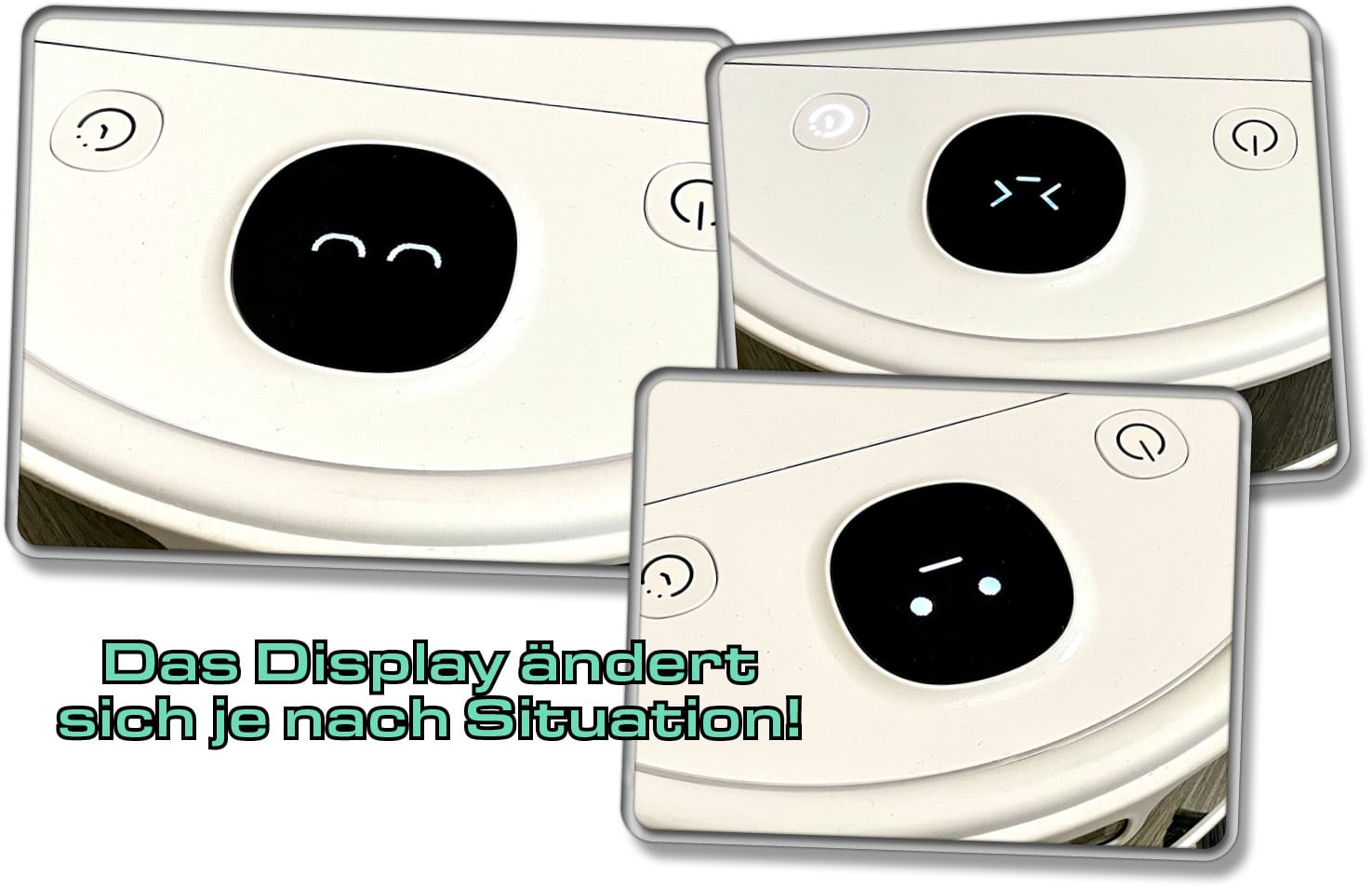 Zwischen den Bedienelementen sitzt ein kleines, doch sehr hochwertig wirkendes Display, das kleine Smiley-Gesichter abbildet und so verschiedene Situationen darstellt. Muss der Roboter zurück zur Ladestation, da der Akku zur Neige geht, dann symbolisiert er das durch ein Gesicht, das aussieht, als würde er seine kleinen Augen zusammenkneifen. Insgesammt warten sieben Gesichtsausdrücke oder Symbole auf deine Entdeckung.