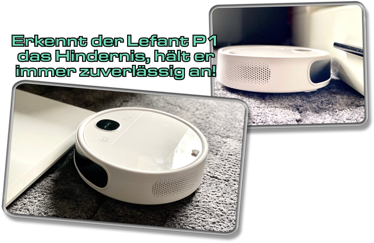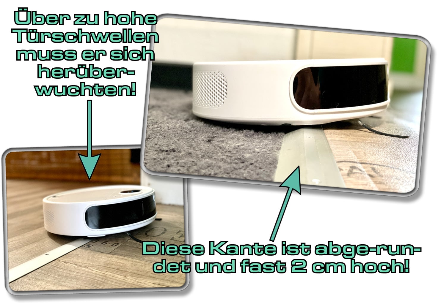 Türschwellen sind eine etwas größere Herausforderung für einen solch kleinen Saugroboter. Zwar packt der Lefant P1 zuverlässig jede harte Kante mit einer Höhe von 1,5 cm, doch sollte diese mal größer sein, muss er passen. Abgerundete Kanten jedoch schafft er auch in höheren Ausmaßen.