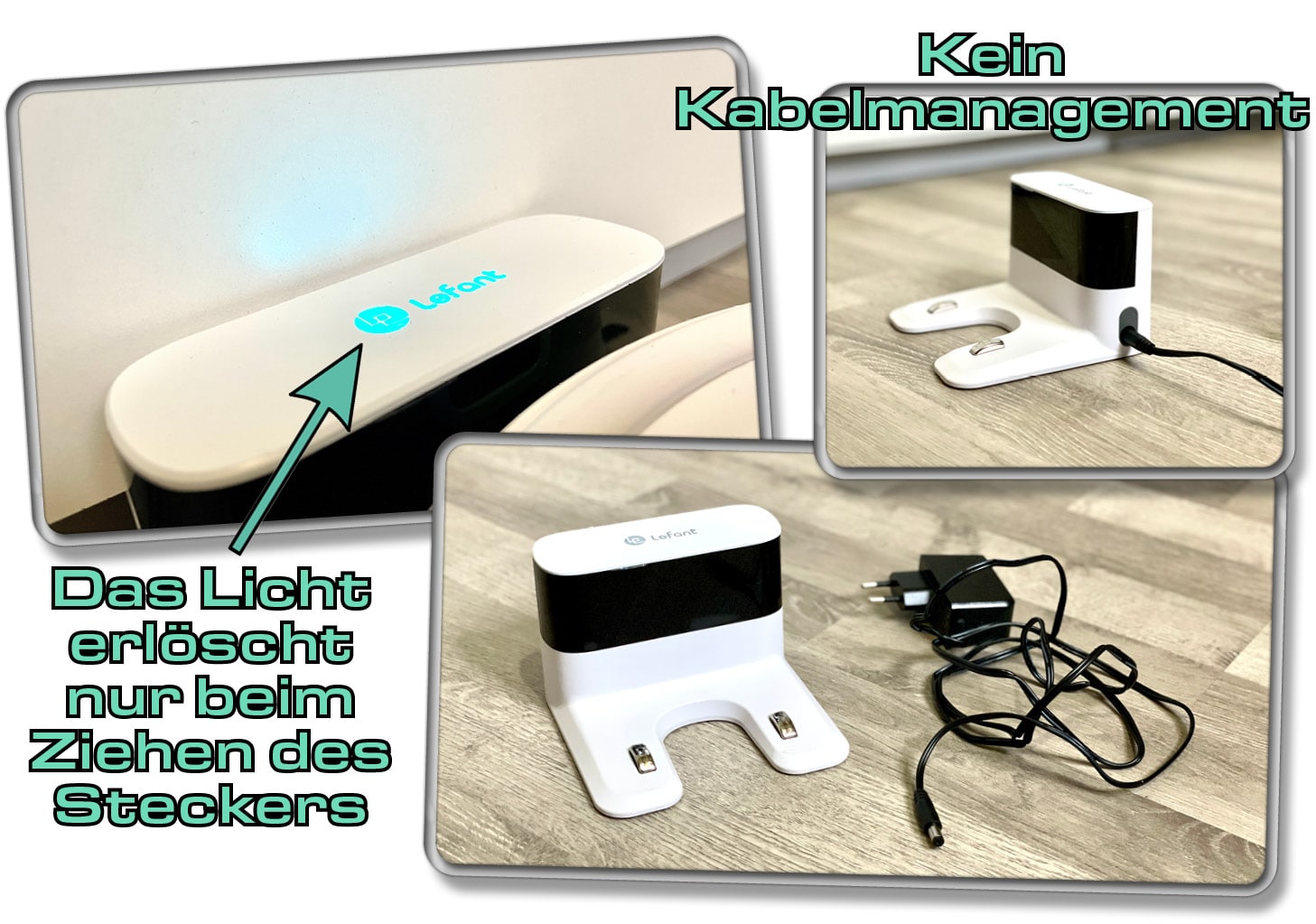 Die Ladestation ist von ihren Ausmaßen her ebenso ziemlich klein. Darum ist wohl auch kein Kabelmanagement vorhanden. Wo bitte soll man das Kabel in dieser kleinen Ladestation auch unterbringen? Auf der Oberseite ist ein stark beleuchtetes Logo des Herstellers, das nicht deaktivierbar ist. Somit eignet sich der Lefant P1 nicht für einen Stammplatz im Schlafzimmer.