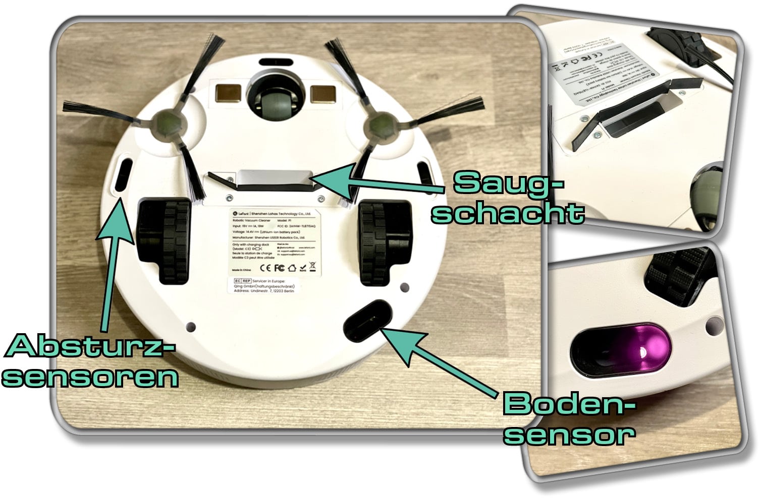 Auf der Unterseite gibt es dahingegen ein doch recht ungewohntes Bild zu entdecken. Alles Gewohnte ist irgendwie in einem Mini-Format vorhanden. Er besitzt drei Absturzsensoren, zwei rotierende Seitenbürsten, einen Bodensensor und einen reinen Saugschacht. Du hast richtig gehört! Der Lefant P1 hat keine Bodenbürste.