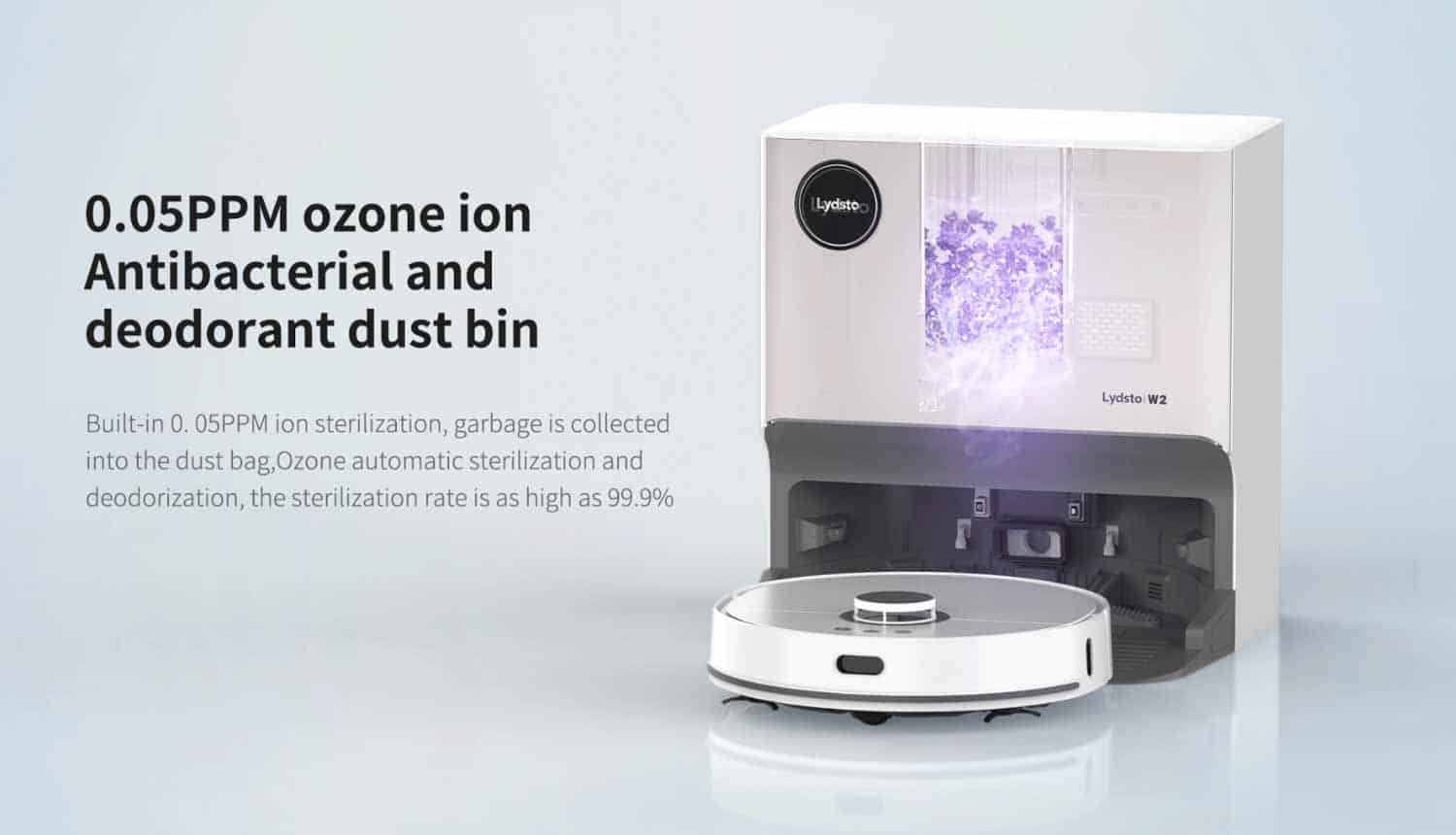 Ozon ist dafür bekannt, eine sterilisierende Wirkung zu haben. Das nutzt der Lydsto W2 ganz für sich aus. Der Staubbeutel in der Station wird durch elektrochemisch erzeugtes Ozon desinfiziert und infolgedessen Gerüche vernichtet. Somit muss man sich keine Sorgen machen, dass der Roboter oder dessen Station irgendwann anfängt zu stinken.