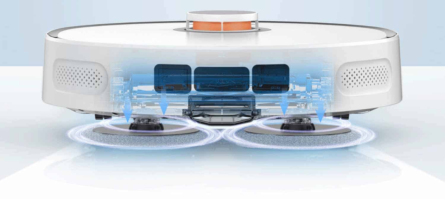 Die Wischfunktion besteht bei diesem Roboter aus rotierenden Wischmopps. Diese werden mit einem konstanten Druck und mit einer starken Rotation auf den Boden gedrückt. Diese Art der Wischfunktion kann durchaus das Wischen von Hand ersetzen. Selbst eingetrocknete Flecken haben hier kaum eine Chance.