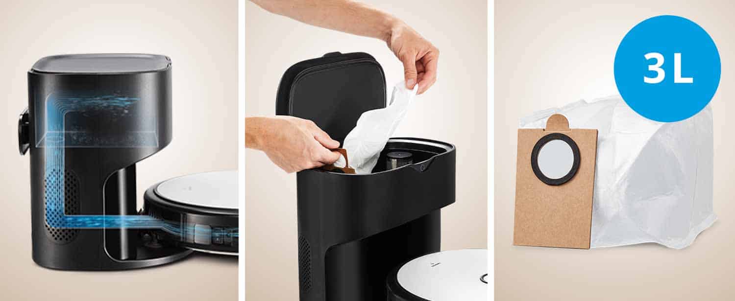 Ein starker Unterdruck befördert den Schmutz aus dem Staubbehälter ohne große Umwege in die Station und in den eingesetzten Staubbeutel. Dieser hält mit 3 Liter Volumen mehrere Wochen ohne einen Wechsel durch. Wenn er dennoch mal voll ist, dann ist das Wechseln ein Kinderspiel. Einfach herausziehen und einen neuen einsetzten. Beim Herausziehen verschließt sich der Staubbeutel selbstständig, damit du nicht mit dem Schmutz in Berührung kommst. Ideal also für Allergiker!