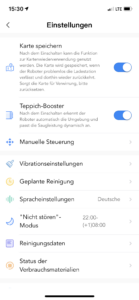 In der App kann man zwischen zwei verschiedenen Modi beim Wischen auswählen, sodass neben einer „normalen“ auch eine gründlicher Wischfunktion möglich ist, bei welcher der Saugroboter etwas engere Bahnen zieht, um Bereiche häufiger zu überfahren.