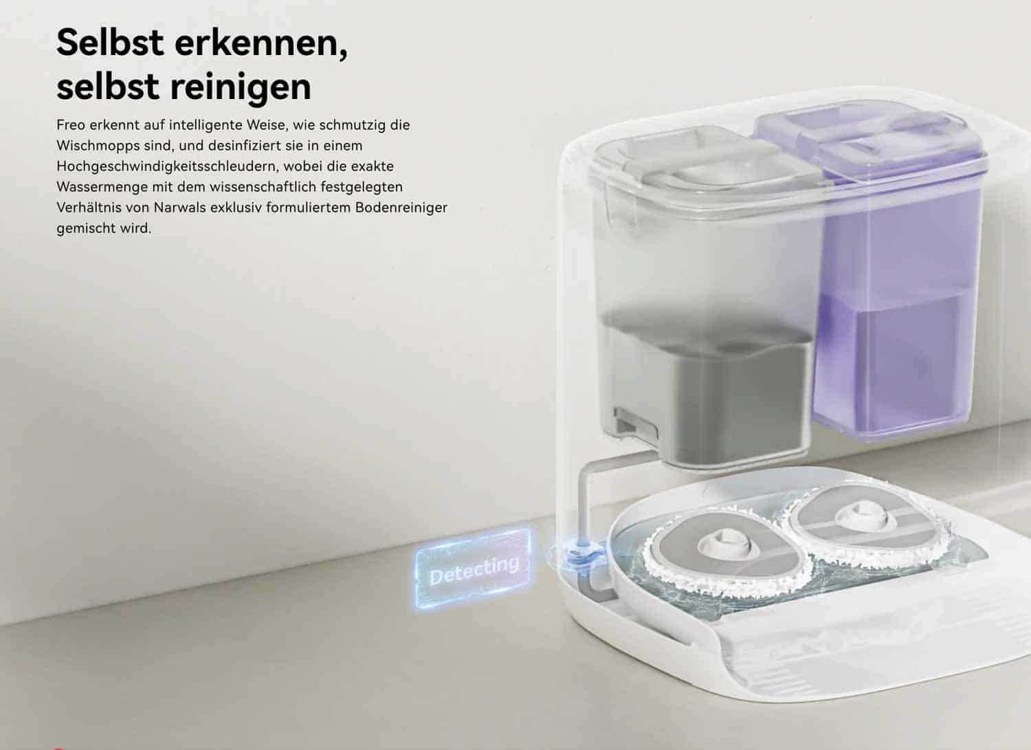 Der Narwal Freo verfügt über eine sogenannte Waschstation. Diese ist nicht nur seine Ladestation, in der er sich auflädt, sondern auch eine Waschanlage für die Wischmopps. Während und nach jeder Reinigung kehrt der Roboter in seine Station zurück, um seine Wischmopps reinigen zu lassen. Für die Frischwasserzufuhr und das Abpumpen des Schmutzwassers bei der Moppwäsche, sorgen zwei große Tanks im Inneren der Station.