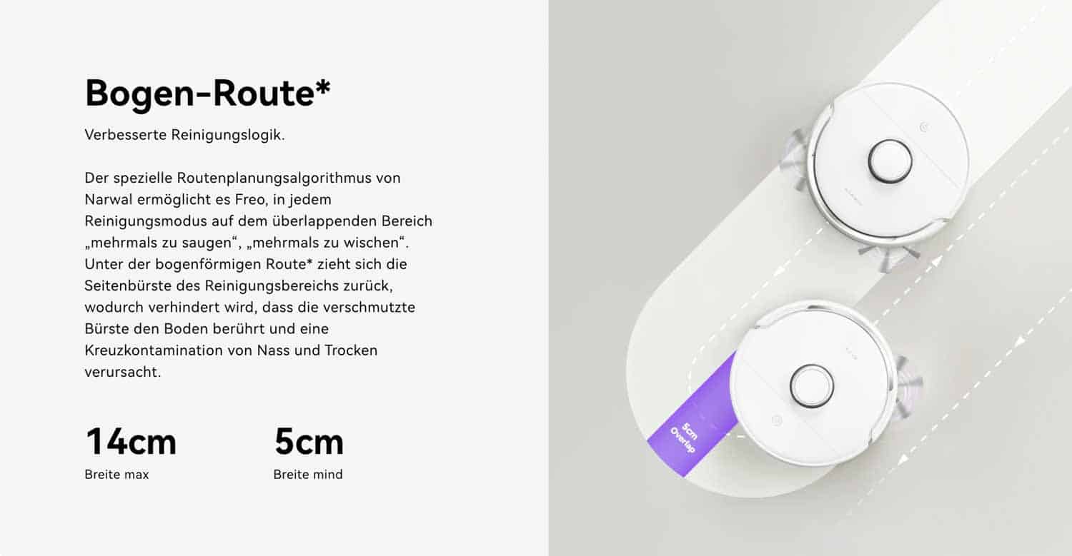 Dank des aufgesetzten Laserturms, kann der Roboter seine Umgebung bis auf kleinste Detail abtasten. Der LiDAR-Scanner im Turm wirft einen Laserstrahl der Klasse 1 aus, der von einem Sensor wieder eingefangen wird. Dazu rotiert der Scanner schnell um 360 Grad und kann so einen detaillierten Grundriss deines Zuhauses erstellen. An diesem Grundriss orientiert sich der Narwal Freo und plant seine bevorstehenden Routen intelligent. Durch diese Technik ist er in der Lage in geraden und zielsicheren Bahnen zu navigieren.
