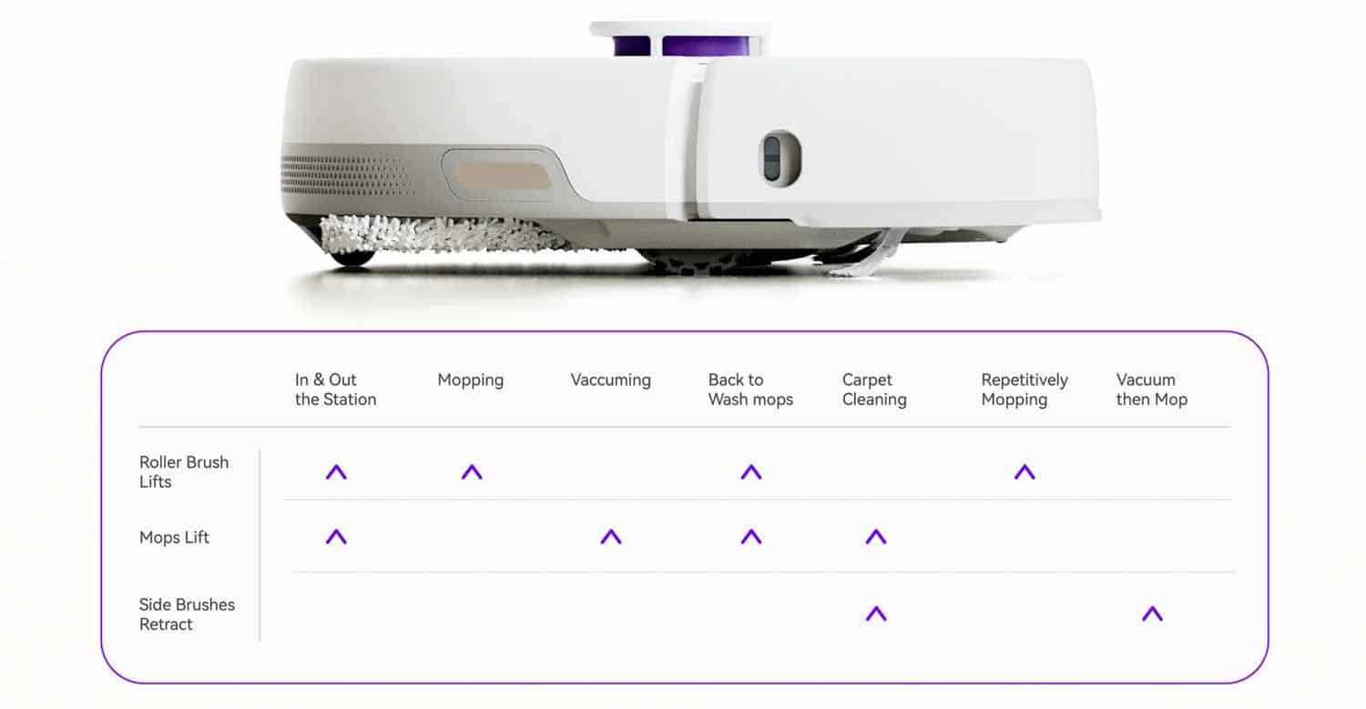 Damit der Randbereich auch mal etwas von der Wischfunktion sieht, verfügt der Roboter über die Corner-Traps-Technologie. Das ist ein Rand-Fahr-Modus, der den Roboter hin und her schaukeln lässt, damit die rotierenden Wischmopps bis an den Rand gelangen. Zudem erkennt der Roboter durch einen Ultraschallsensor, ob er sich auf Teppichboden oder Hartboden befindet. Wenn er sich Teppich nähert, dann hebt er seine Wischmopps in die Höhe, damit der Teppich nicht nass wird.