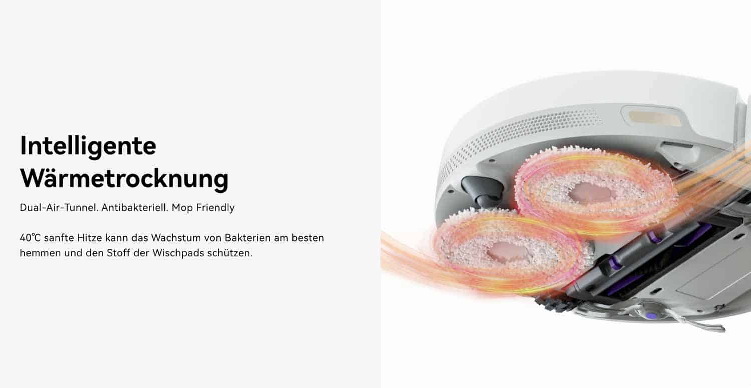 Damit die Wischmopps richtig sauber werden, hat die Station einen integrierten Reinigungsmittelspender. Dieser setzt Reinigungsmittel bei jeder Moppwäsche frei. Nach jeder Reinigung schaltet sich zudem eine Heißlufttrocknung ein, die die Wischmopps mit 40° Grad trocknet. So können sich schwerer Keime und Bakterien bilden.