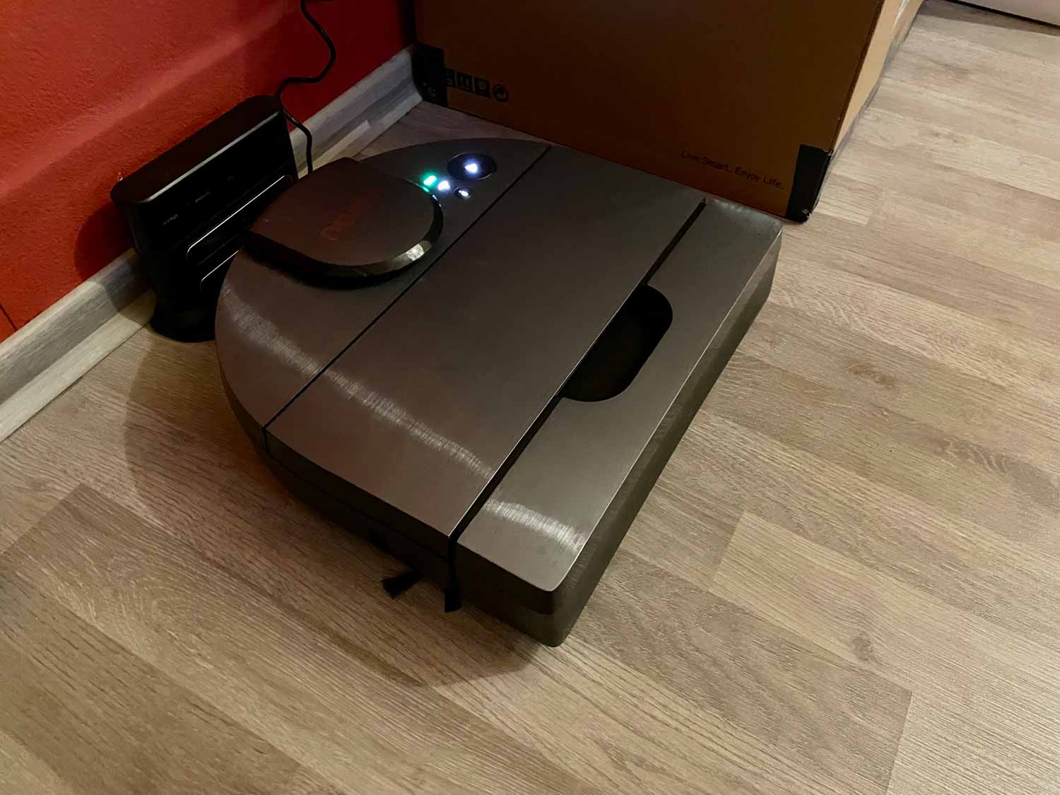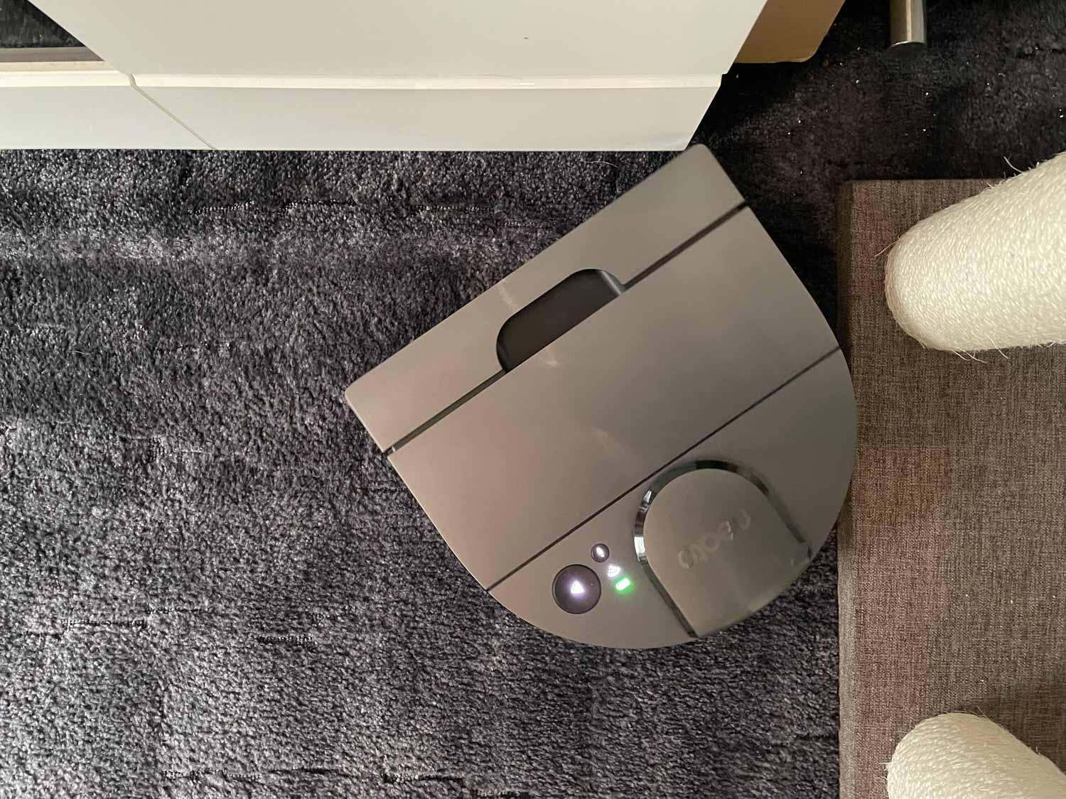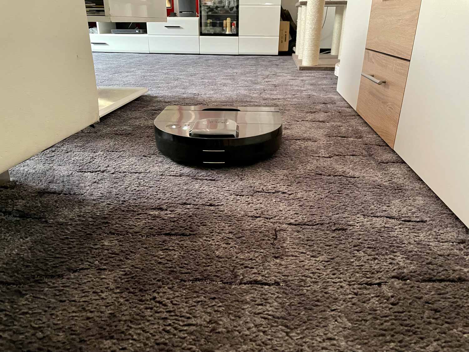 Bei diversen Türschwellen muss man sich dafür keine Sorgen machen. Dadurch, dass der Roboter an der Front leicht abgerundet ist, schiebt er sich immer wieder über Hindernisse oder Türschwellen, die zwei bis drei cm hoch sein können. Also klettern kann er hervorragend. Manchmal etwas zu sehr. Da er versucht sich wirklich über alles drüber zu schieben, werden Füße von Kratzbäumen, Waagen, Schuhe oder Ähnliches schnell zur Falle. Da hängt er sich gerne immer mal wieder auf. Auch in Engstellen, in denen er zurücksetzt, hängt er sich gerne einfach an einer hinter ihm gelegene Wand auf. Das macht keinen Spaß und man jagt die ganze Zeit dem Roboter hinterher.