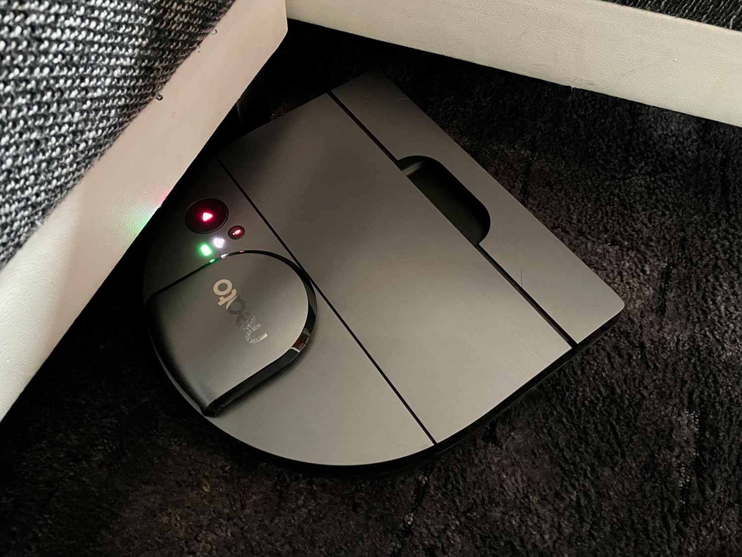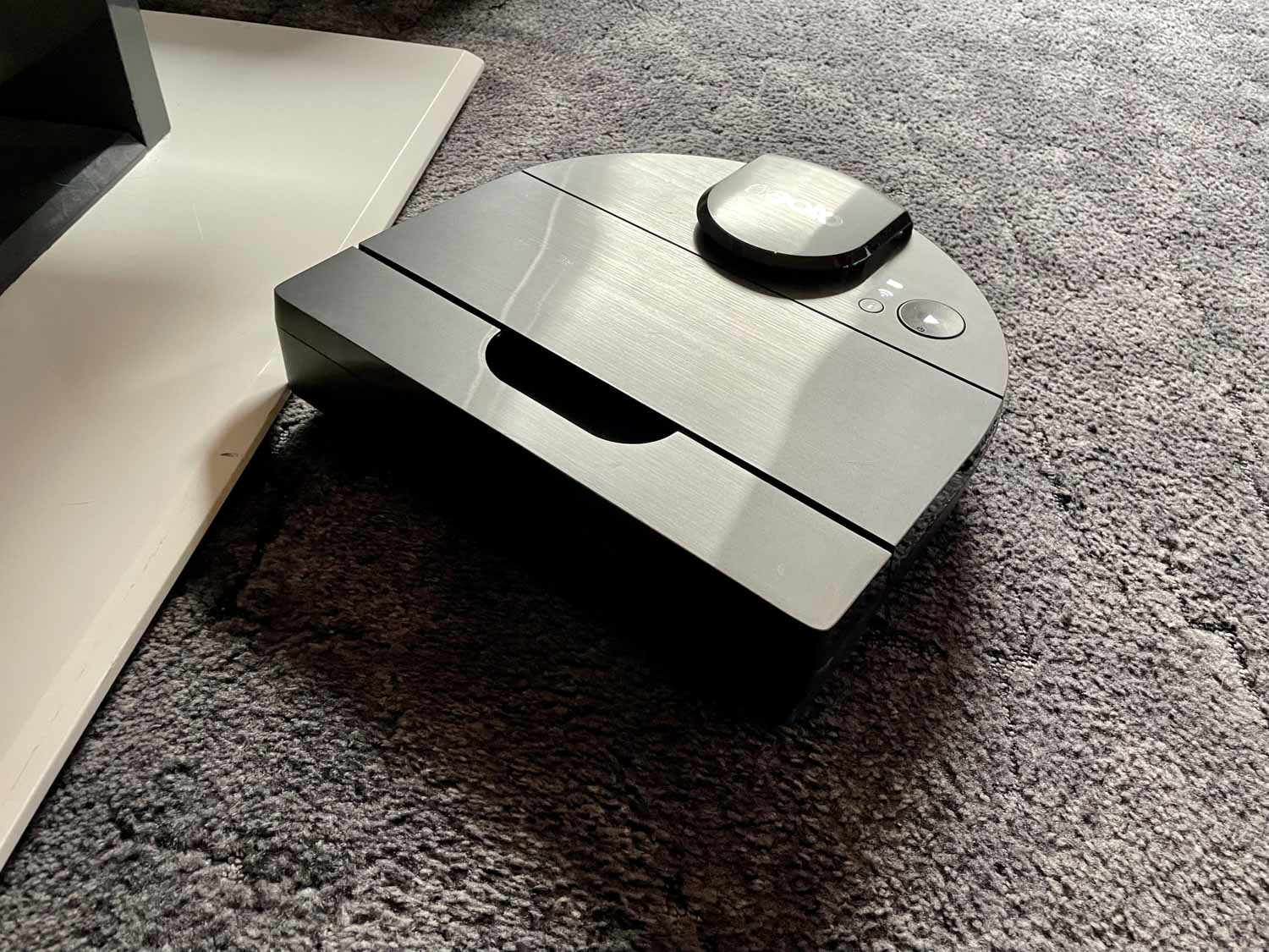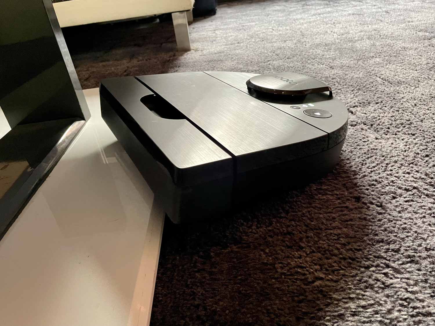 Die Hinderniserkennung ist, kurz gesagt, nicht vorhanden. Natürlich besitzt der Neato D10 einen Bumper, mit dem er sich überall entlangtastet. Jedoch gibt es, außer dem LIDAR-System, keinerlei Sensorik, die dem Roboter sagen, was vor ihm liegt. Das kann dann auch gerne mal dazu führen, dass er mit seiner D-Form in eine Engstelle hineinfährt und sich dort völlig verkeilt oder einfach nicht mehr herauskommt. Auch werden Hindernisse, die sich unterhalb der Höhe des Laserturms befinden, mit voller Wucht angerempelt oder über den Haufen gefahren. Man sollte also lieber alles aus dem Weg räumen, wenn man den Roboter losschickt. Er besitzt einen starken Willen und hat viel Kraft.