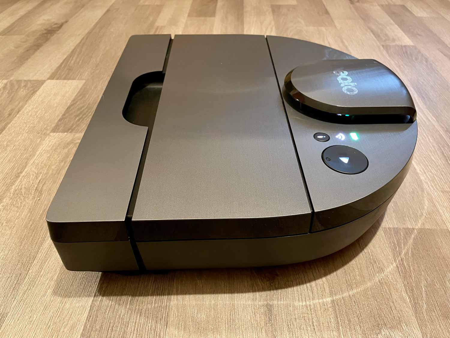 Der Neato D10 besitzt eine schön anmutende und glänzende Oberfläche. Sie ahmt gebürstetes Aluminium nach, ist jedoch aus Kunststoff. Die Neuerung stellt der LiDAR-Sensor dar, der nun in einem neuen Design auf dem Roboter plaziert wurde. Leider besitzt der Turm keinen Bumper und ist somit nicht vor dem Einklemmen geschützt. Daneben befinden sich die Steuerelemente, die sich aus einer Akku- und WIFI-Anzeige, einem Informationsknopf und einem Startknopf zusammenstellen. Ein praktischer Tragegriff am vorderen Bumper rundet das Design ab.