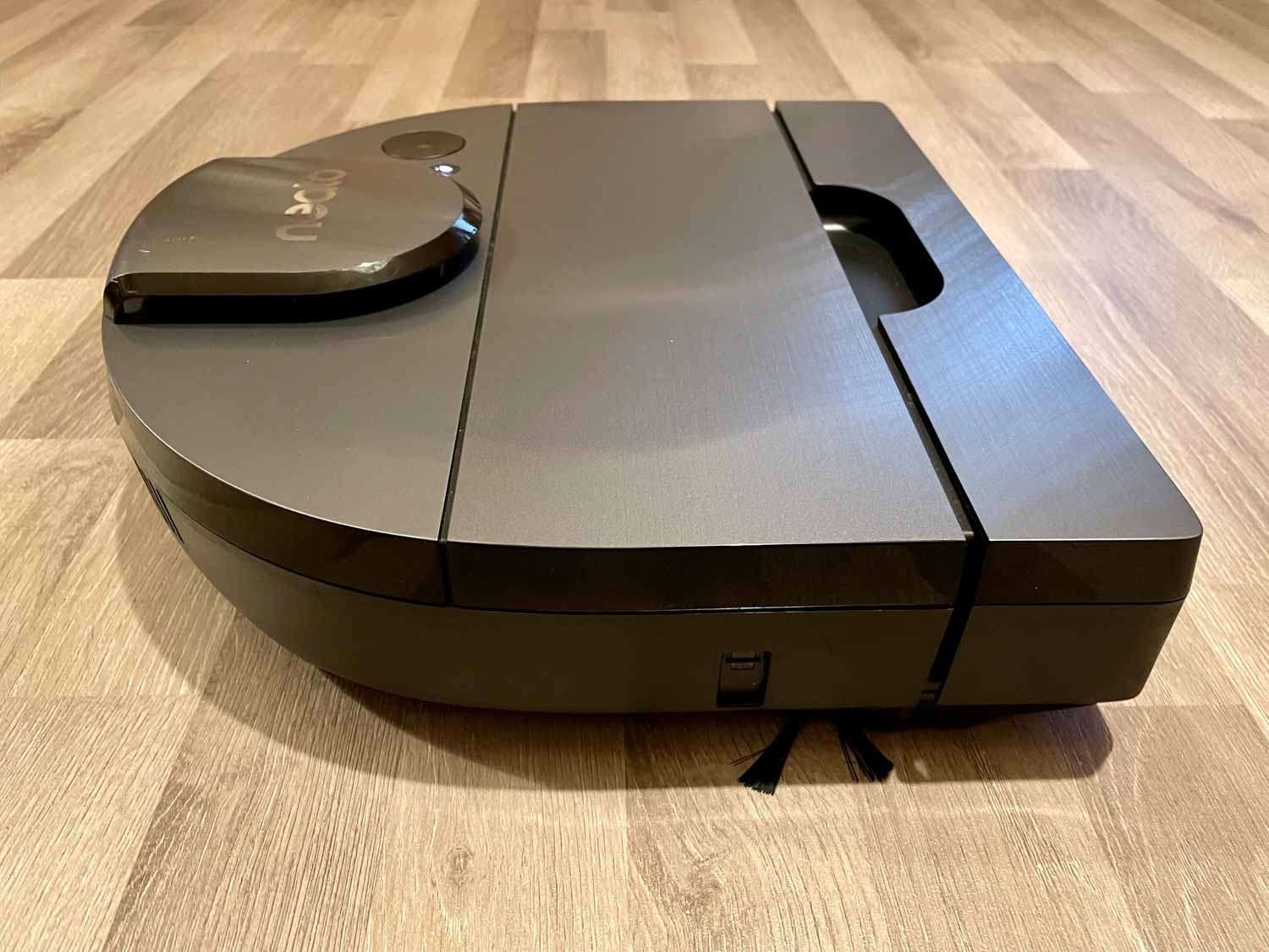 Seitlich findet man nicht viel. Ein Bumper, der auf der Front aufgesetzt ist, dient eher als Taster, da er mit keinerlei Sensorik bestückt ist. Auf der Seite erblickt man einen kleinen Wandsensor und auf dem Heck die Ladekontakte, einen Luftauslass und ein kleines Gitter, aus dem die Sprachausgabe ausgegeben wird.