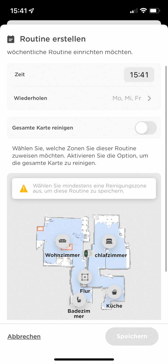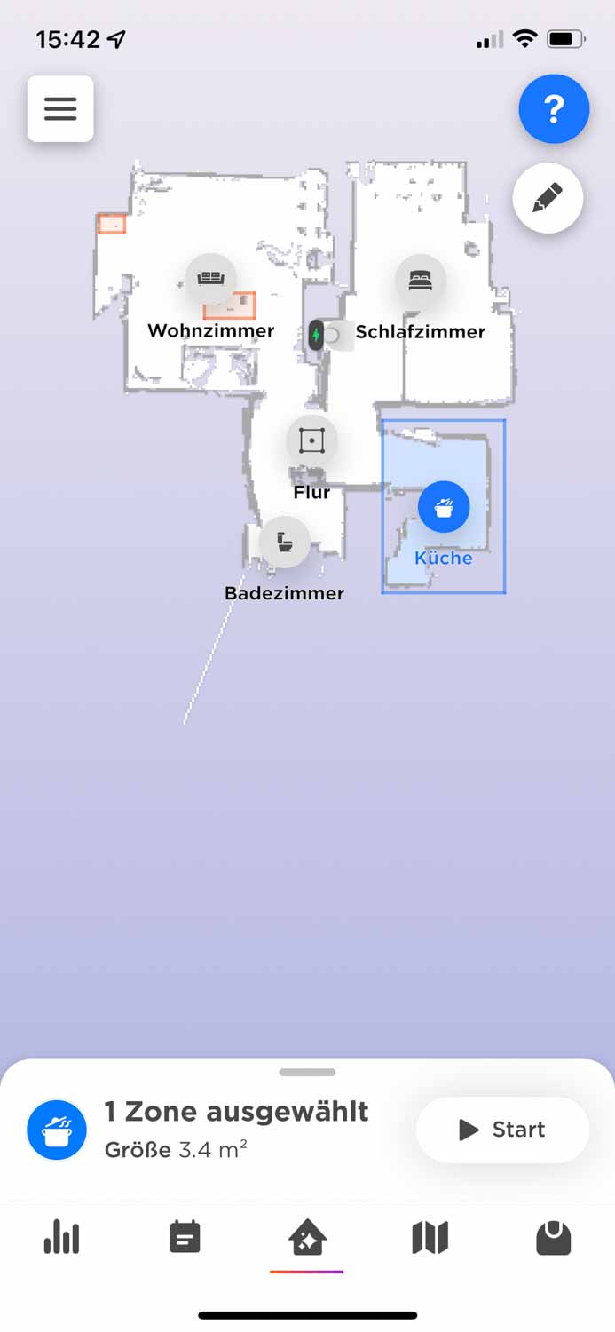 Auf der Startseite sieht man die erstellte Karte und dessen Zonen, die man eingerichtet hat. Man kann ihn von dieser Seite aus auch starten, pausieren oder zur Station zurückschicken. Der Saugmodus ist ebenfalls einstellbar. Dabei muss man aber aufpassen, da vor der Reinigung der Saugmodus eingestellt werden muss. Während einer Reinigung kann man diesen ärgerlicherweise nicht mehr umstellen. Warum auch immer. Falls der Roboter stecken oder hängen bleibt, gibt es auch eine Funktion ihn zu lokalisieren. Da das ziemlich häufig vorkommt, ist diese Funktion traurigerweise sehr hilfreich. Auf der Startseite wird einem übrigens auch die Akkuladung angezeigt. Einzelne Räume sind wie erwähnt ebenfalls in einem Reinigungsdurchgang ansteuerbar. Jedoch muss man bedenken, es ist immer nur ein einziger Raum ansteuerbar und nicht etwa zwei oder drei hintereinander.