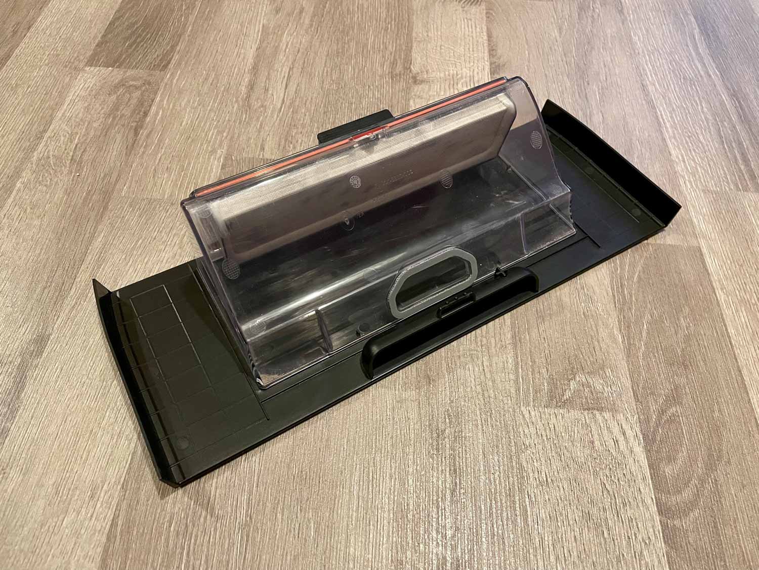 Der sehr große Staubbehälter lässt sich ebenfalls auf der Oberseite herausnehmen. Er ist, bis auf den Deckel, vollständig transparent und mit einem Feinstaubfilter besetzt, der auch ein Netz als Schutz vor grober Verschmutzung besitzt.