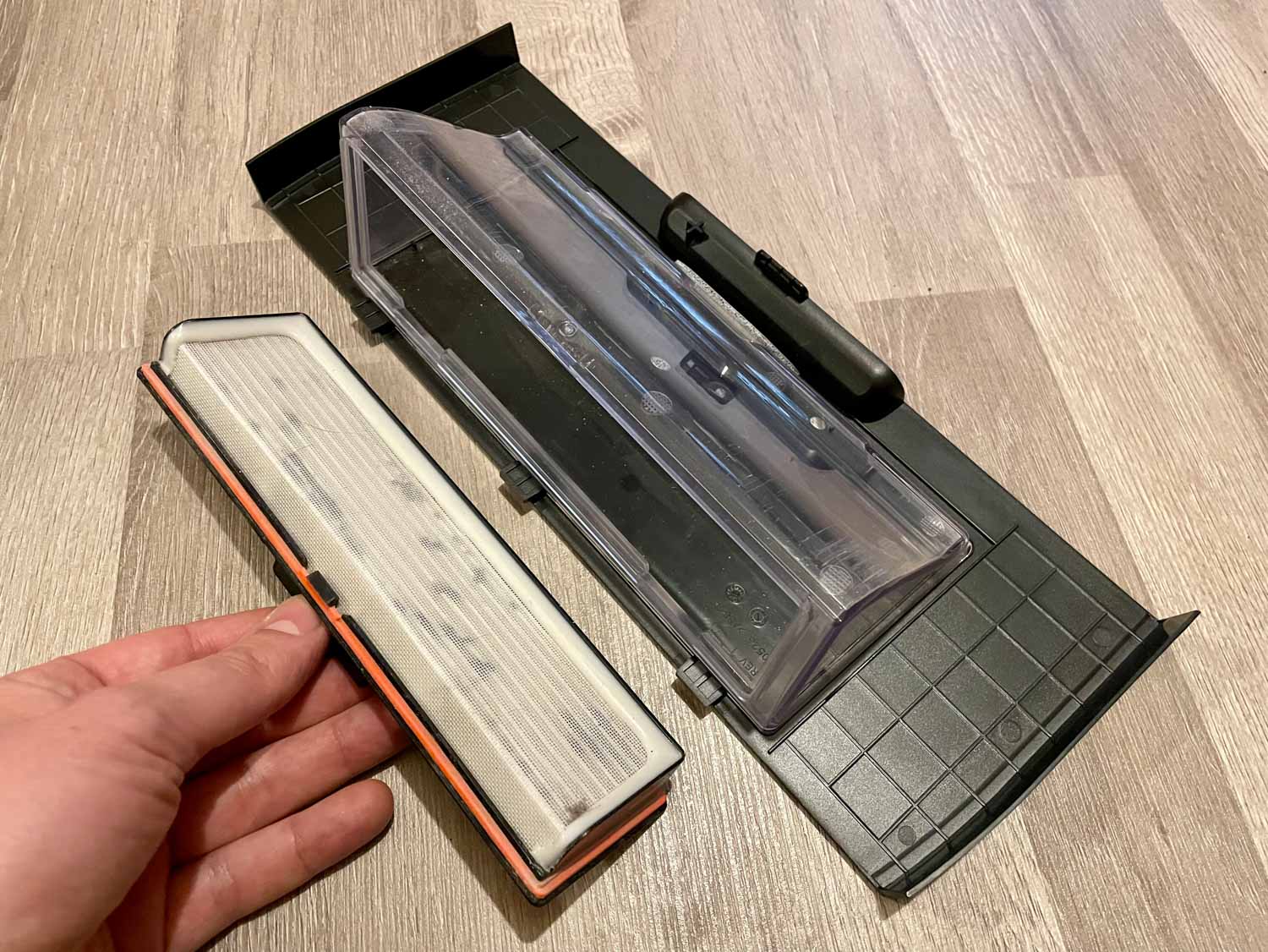 Der transparent gehaltene Staubbehälter fungiert gleichzeitig als Abdeckung auf der Oberseite. Er fasst unglaubliche 700 ml Fassungsvermögen, was eine ganze Menge ist in der Welt der Saugroboter. Um den Staubbehälter auszuleeren, muss man den eingesetzten Feinstaubfilter entfernen. Dabei hängt gerne etwas Schmutz am Filter, also aufpassen beim Entleeren.