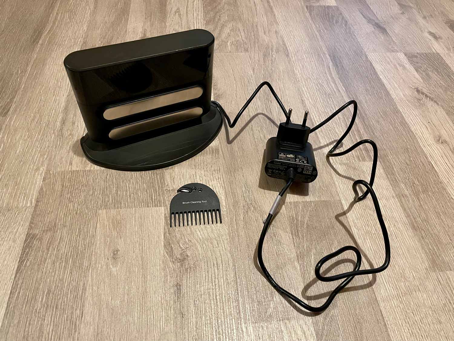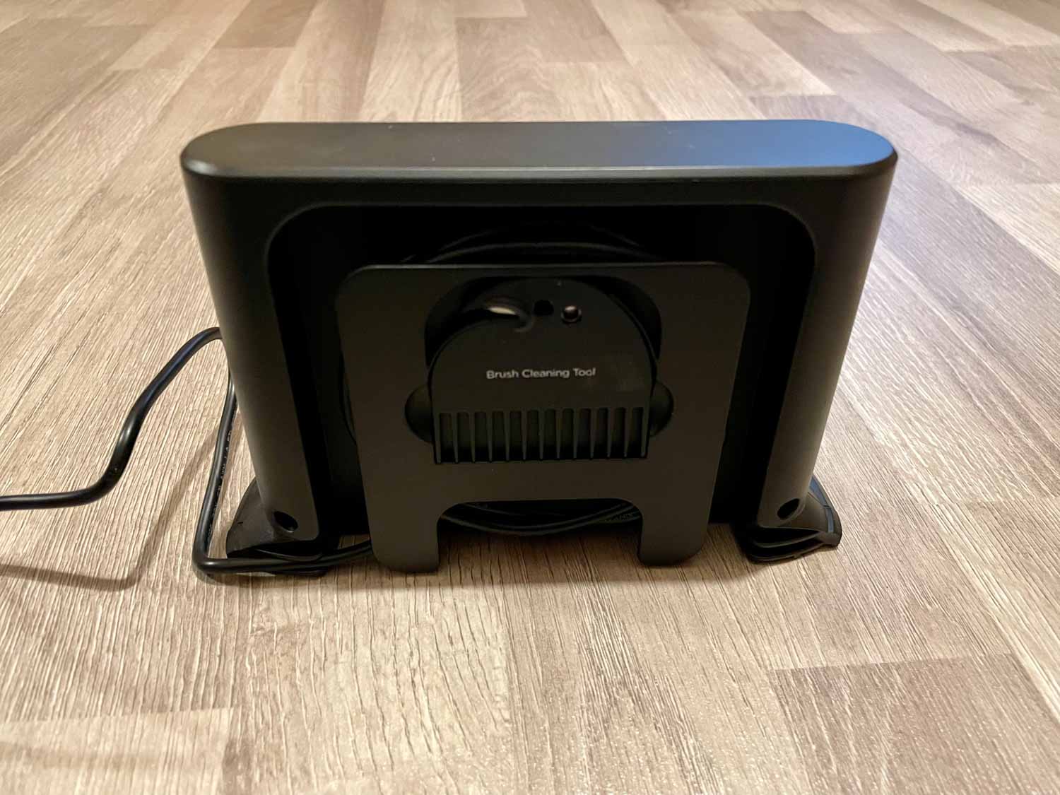 - Die Ladestation mit integriertem Reinigungstool