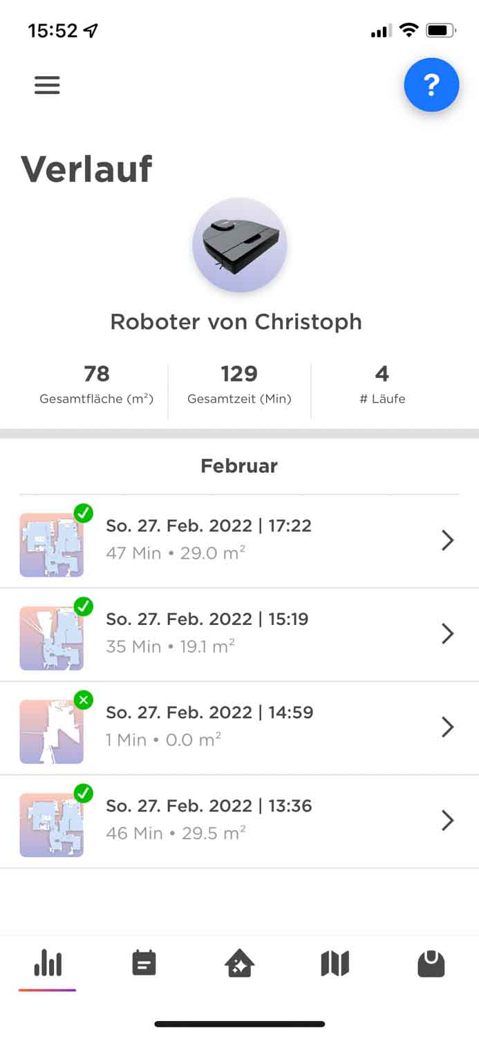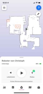 Auf der Startseite sieht man die erstellte Karte und dessen Zonen, die man eingerichtet hat. Man kann ihn von dieser Seite aus auch starten, pausieren oder zur Station zurückschicken. Der Saugmodus ist ebenfalls einstellbar. Dabei muss man aber aufpassen, da vor der Reinigung der Saugmodus eingestellt werden muss. Während einer Reinigung kann man diesen ärgerlicherweise nicht mehr umstellen. Warum auch immer. Falls der Roboter stecken oder hängen bleibt, gibt es auch eine Funktion ihn zu lokalisieren. Da das ziemlich häufig vorkommt, ist diese Funktion traurigerweise sehr hilfreich. Auf der Startseite wird einem übrigens auch die Akkuladung angezeigt.
