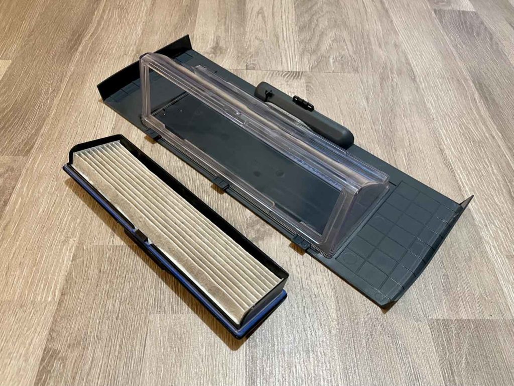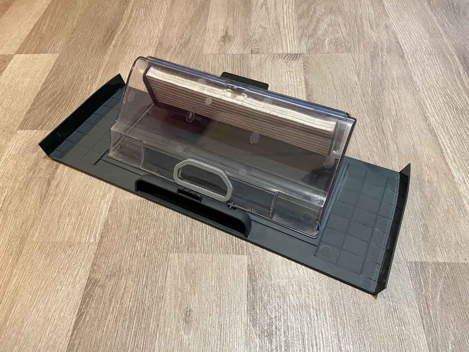 Der transparent gehaltene Staubbehälter fungiert gleichzeitig als Abdeckung auf der Oberseite. Er fasst unglaubliche 700 ml Fassungsvermögen, was eine ganze Menge ist in der Welt der Saugroboter. Um den Staubbehälter auszuleeren, muss man den eingesetzten Feinstaubfilter entfernen. Dabei hängt gerne etwas Schmutz am Filter, also aufpassen beim Entleeren. Ein weiteres Gitter als Schutz für den Feinstaubfilter wäre eine sinnvolle Idee gewesen.