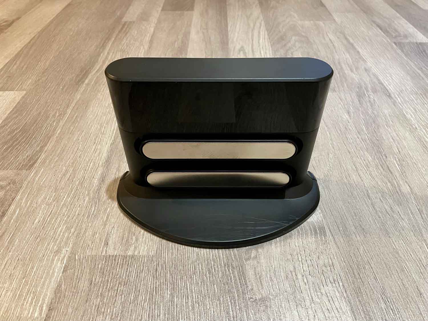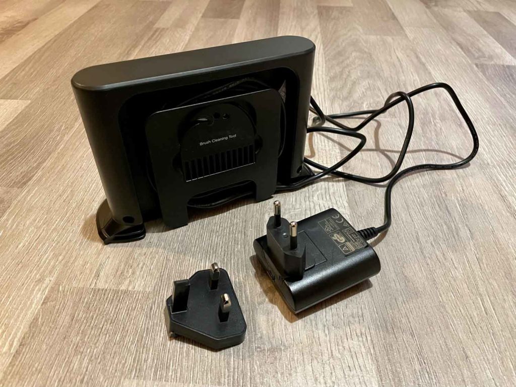 Die komplett in schwarz gehaltene Ladestation beherbergt auf der Rückseite eine praktische Kabelaufwicklung, um dem Kabelsalat den Kampf anzusagen. Ebenfalls ist ein praktisches Reinigungstool auf der Rückseite integriert, die zum Reinigen des Roboters oftmals sehr hilfreich ist. Das mitgelieferte Ladekabel besitzt einen deutschen und einen ausländischen Steckaufsatz. Es ist auf beiden Seiten aus der Station herausführbar. Auf der Front erkennt man schnell die zwei metallenen Ladekontakte. Da die Kontakte am Heck des Roboters angebracht wurden, sitzen sie auf der Station nicht wie gewohnt auf dem Boden.