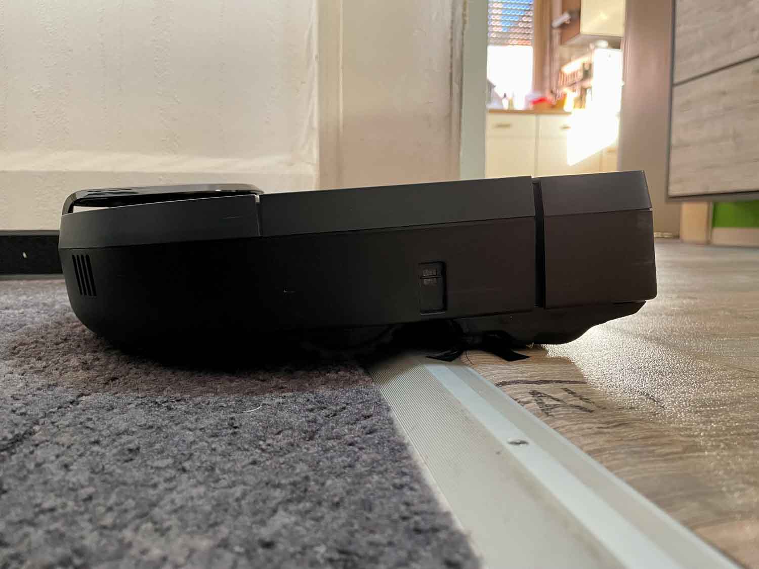 Bei diversen Türschwellen muss man sich dafür keine Sorgen machen. Dadurch, dass der Roboter an der Front leicht abgerundet ist, schiebt er sich, dank seiner Kraft, immer wieder über Hindernisse oder Türschwellen, die zwei bis drei cm hoch sind. Also klettern kann er hervorragend. Manchmal etwas zu sehr. Da er wirklich versucht sich über alles und jeden drüber zu schieben, werden Füße von Kratzbäumen, Waagen, Schuhe oder Ähnliches schnell zur Falle. Da hängt er sich gerne immer mal wieder auf. Auch in Engstellen, in denen er zurücksetzt, hängt er sich gerne einfach an einer hinter ihm gelegene Wand auf. Das macht keinen Spaß und man jagt die ganze Zeit dem Roboter hinterher.