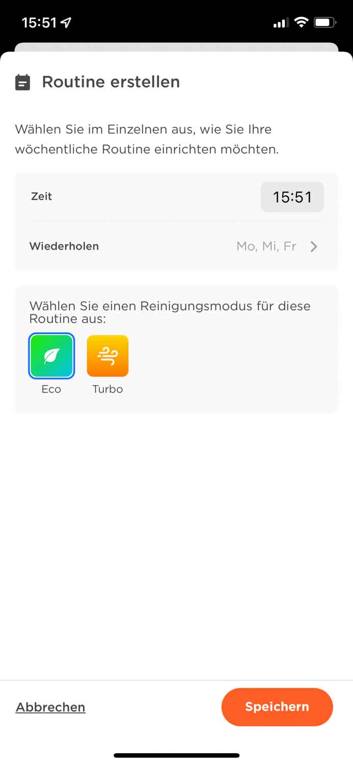 Das Einstellen einer zeitlich startenden Reinigung ist möglich und funktioniert auch recht zuverlässig. Dabei kann man jedoch nur einstellen, zu welcher Zeit das Gerät starten soll und an welchem Tag. Außerdem ist die Saugstufe dabei noch anpassbar. Das war’s auch schon. Schade.