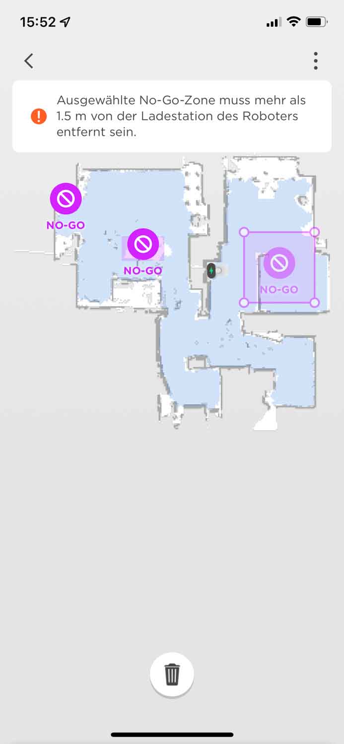 Man hat die Möglichkeit, individuelle Sperrzonen auf der gespeicherten Karte einzupflegen. Das ist sehr einfach und auch relativ genau möglich. Der Roboter befährt diese Zonen zukünftig nicht mehr. Leider gibt es nur Zonen in Form von Quadraten zu setzen. Wände in Form von Linien sind nicht möglich.