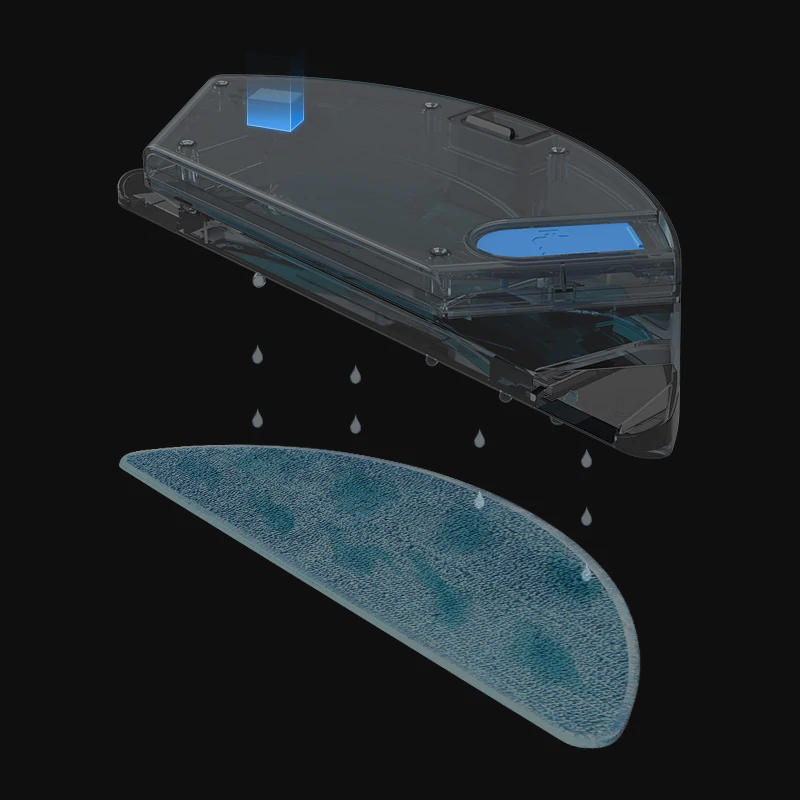 Damit der Neatsvor X600 Pro nicht nur den Boden saugen, sondern gleichzeitig wischen kann, hat der Hersteller dem Gerät einen Wassertank inklusive einer Wischplatte spendiert. Die Wischplatte mit anmontiertem Tuch ist schnell am Wassertank montiert und kann mit Wasser in drei verschiedenen Stufen befeuchtet werden. Das Wischtuch wird einfach hinter dem Roboter hergezogen und sorgt für ein glänzendes Finish. Dabei sollte man auf jeden Fall beachten, dass diese Art der Wischfunktion das Wischen von Hand nicht ersetzen kann. Die elektronische Wischfunktion ist dafür da, den restlich liegen gebliebenen Staub zu entfernen und den Boden zum Glänzen zu bringen.