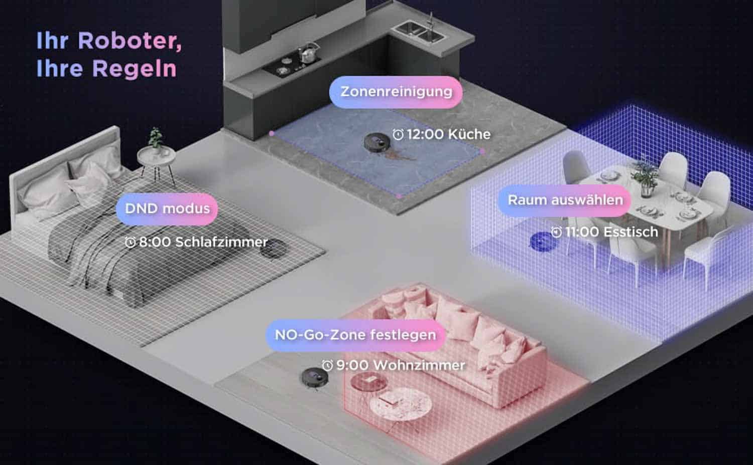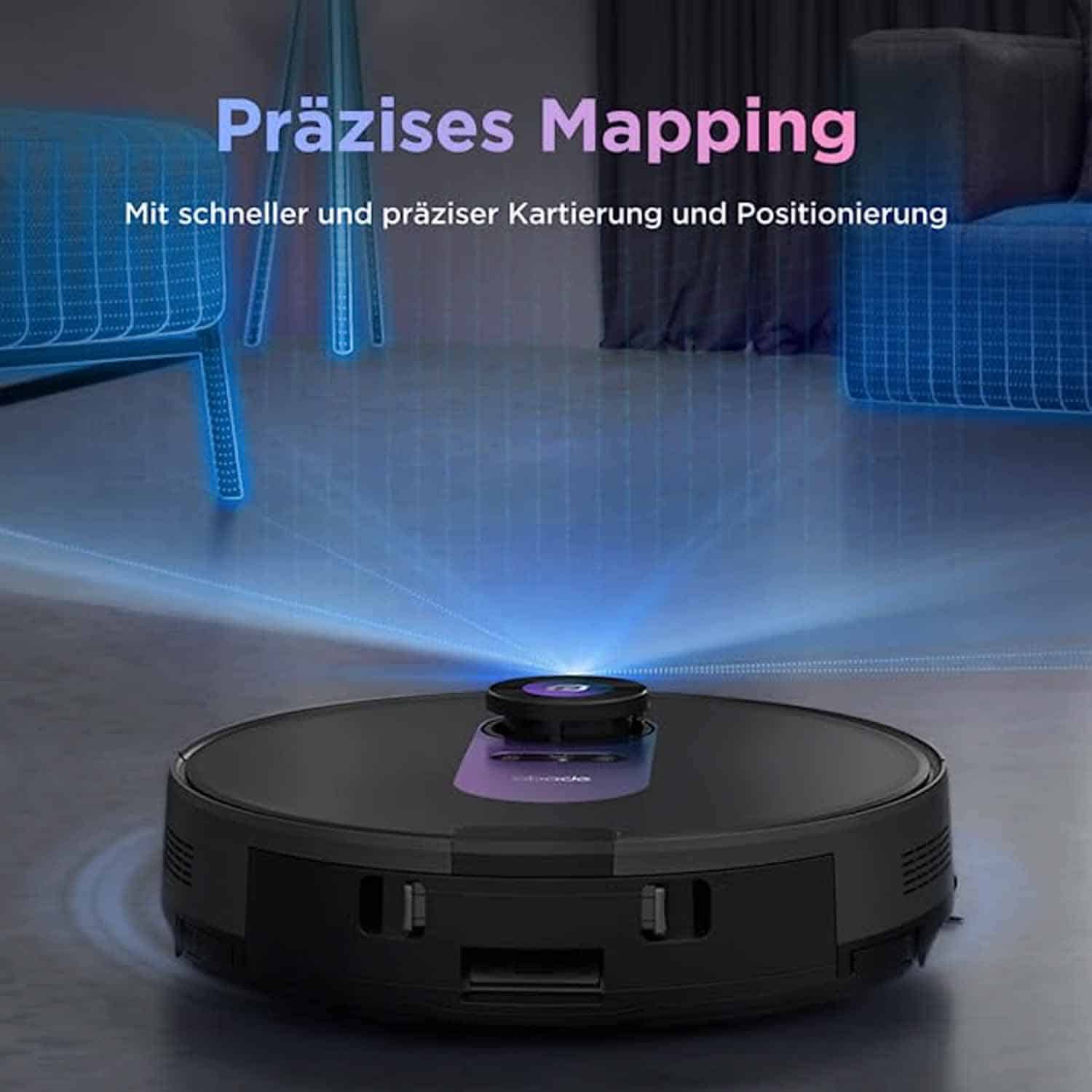 Der Obode A8 ist mit einem sogenannten LiDAR-Scanner ausgestattet, der in Form eines kleinen Turmes auf der Oberseite des Roboters ersichtlich ist. Dieser Scanner wirft während der Fahrt rotierend einen Laserstrahl aus, der von deinen Möbeln, Wänden und jeglichen Gegenständen reflektiert und wieder eingefangen wird. Dadurch erstellt sich der Roboter eine genaue Karte deines Grundrisses, an der er sich orientiert. Diese Technik erlaubt es dem Obode A8 in geraden und vorausgeplanten Bahnen durch dein Zuhause zu navigieren. Er geht bei jeder Reinigung mit Plan und Verstand vor, damit jede Stelle in deinem Haushalt mindestens einmal erreicht wird. Der Randbereich wird dabei genauso beachtet, wie die Mitten der einzelnen Zimmer.