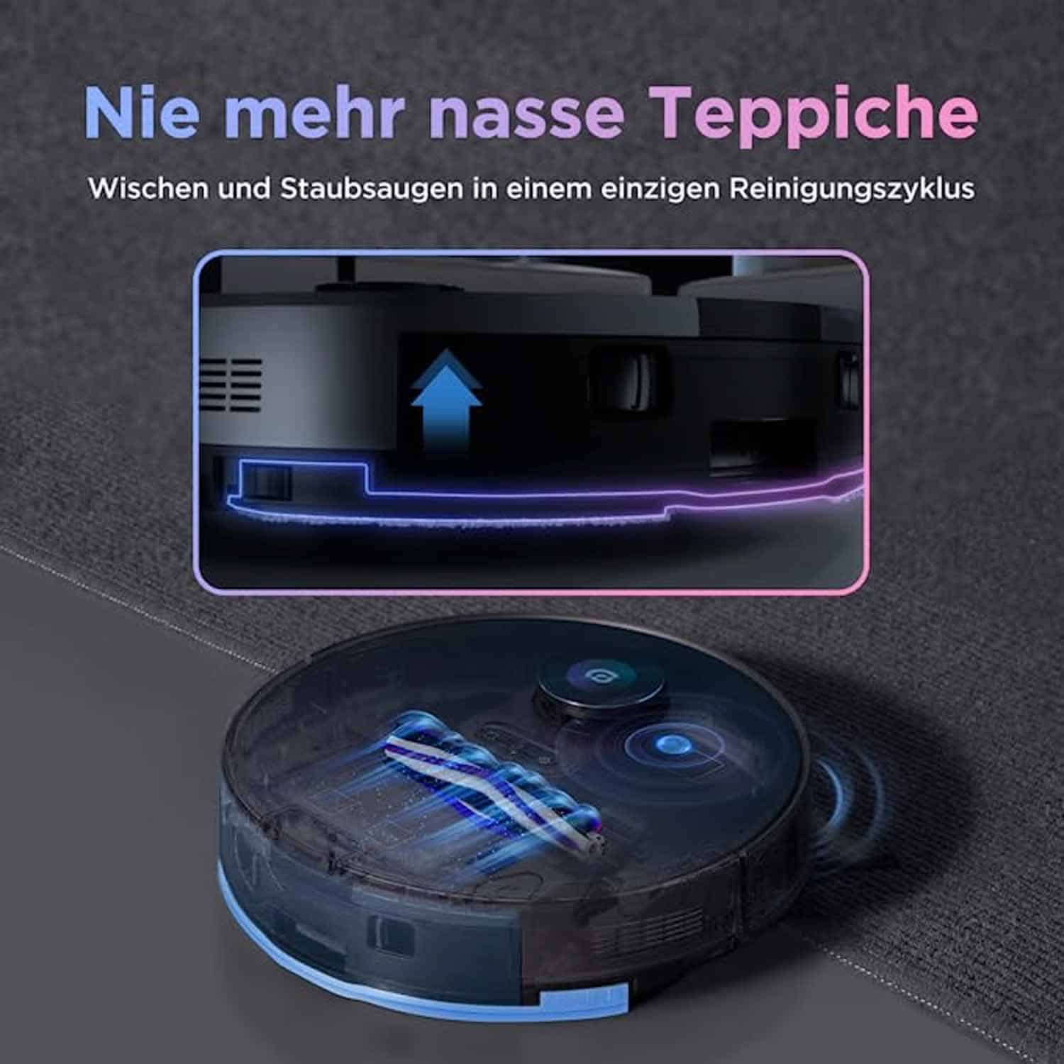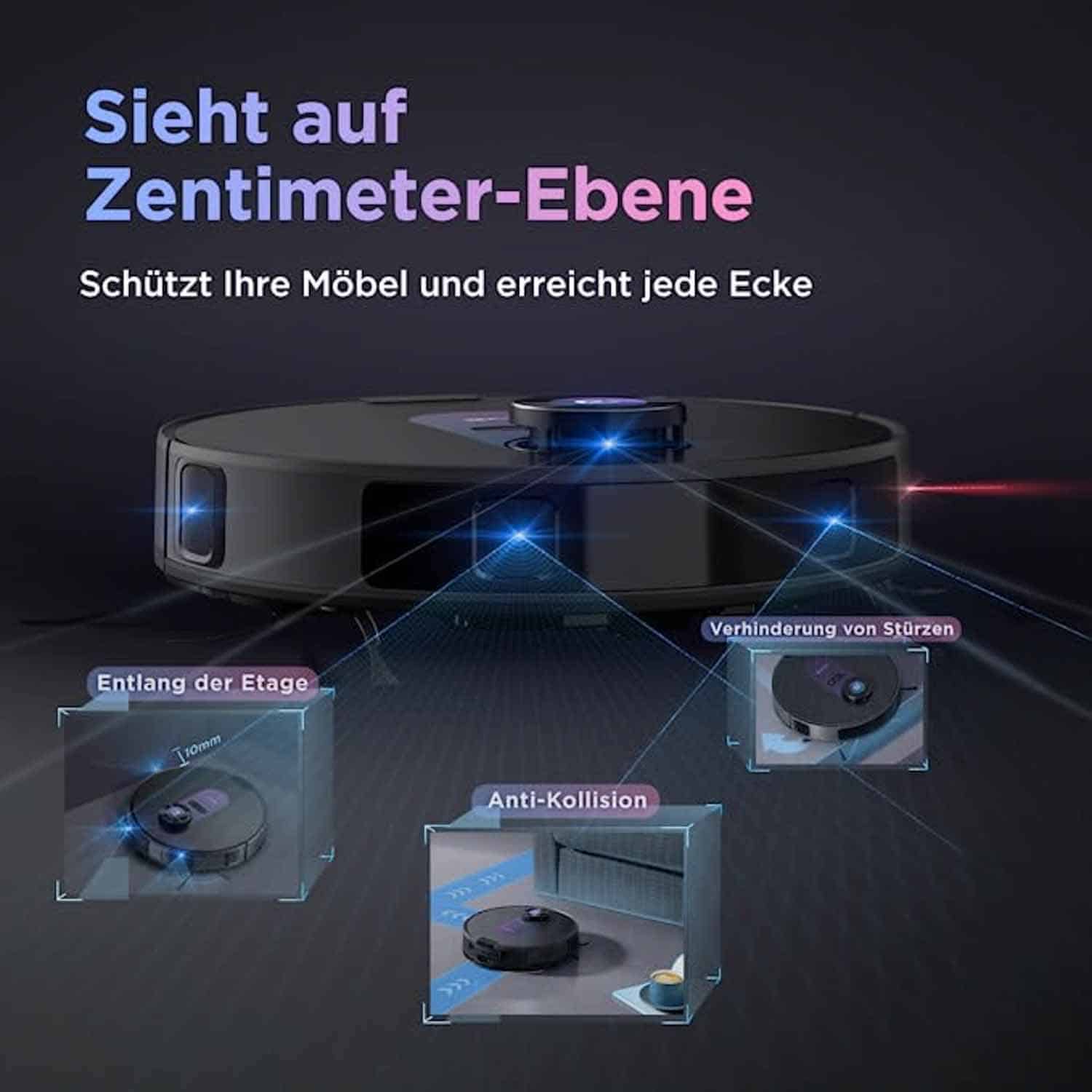 Damit Wände und Möbel keinen Schaden davontragen, besitzt der Roboter zudem verschiedene Infrarotsensoren. Diese sorgen dafür, dass er seine Geschwindigkeit abbremst, wenn er diese erkennt. Damit der Saug-Wischroboter nicht die Treppen herunterfällt, besitzt er ebenso spezielle Absturzsensoren.