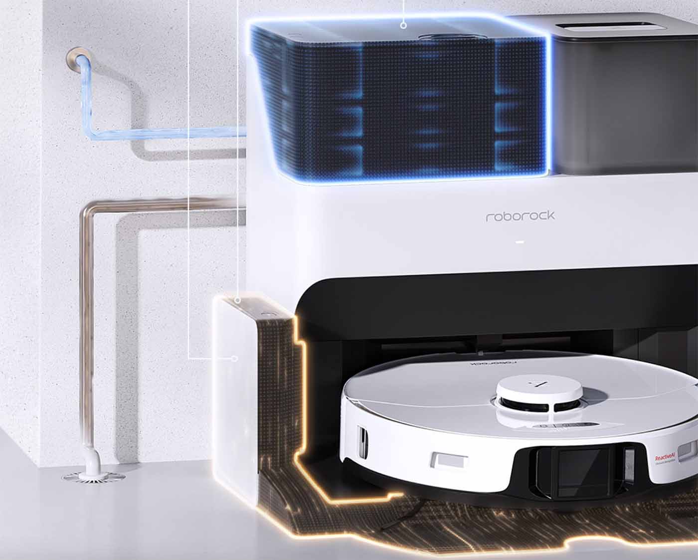 Die erste Neuerung ist die Heißlufttrocknung des Wischtuchs nach der Reinigung. Ein Feature, welches beim S7 MaxV Ultra leider nicht mit an Bord ist. Ebenfalls neu ist ein automatischer Wasserwechsler, über dessen Funktion ich noch nicht vollends im Bilde bin. Auf dem Produktbild oben sieht es so aus, als ob diese mit einem festen Wasseranschluss verbunden werden können. Dies wäre ein weiterer Schritt in Richtung autonomes Reinigen. Roborock nennt das System der Basisstation „5 + 2„. Die Fünft steht für die Basisfunktionen Saugen, Wischen, Reinigen in der Basis, Wasser auffüllen und Sterilisierung des Wassers. Die Zwei steht für die optionalen Funktionen Heißlufttrocknen und Wasserwechsel.