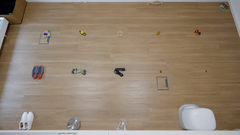 Immerhin liefert der Roborock Qrevo Curv 2 Pro bei der Randreinigung ab. Hier fährt er seinen Wischmopp aus und reinigt parallel und nah an der Wand entlang. Unsere vier Striche werden fast vollständig entfernt.