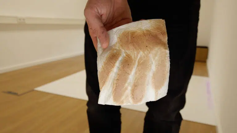 Um die tatsächliche Sauberkeit der gewischten Fläche zu überprüfen, haben wir ein weißes, feuchtes Tuch verwendet und diese manuell abgewischt. Das Ergebnis, wie auf dem Bild deutlich zu sehen, bestätigte unsere Vermutung: Das Tuch zeigt deutliche Schmutzrückstände.