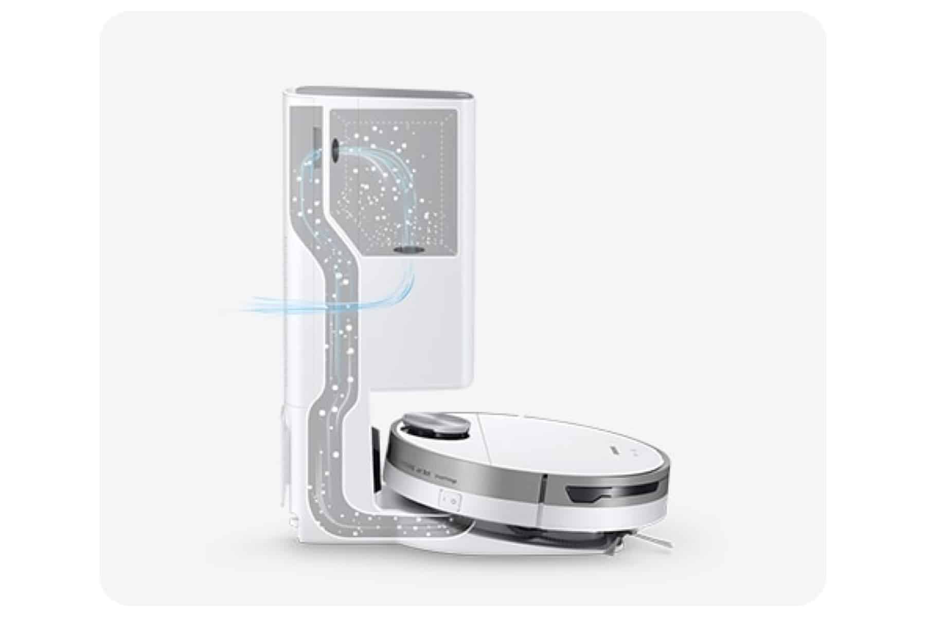 Der Samsung JetBot+ hat eine Absaugstation mit im Lieferumfang dabei. Diese ist platzmäßig sehr einsparend, dafür recht hoch gebaut. Die Absaugstation saugt nach jedem Reinigungsdurchgang den im Roboter eingesetzten Staubbehälter vollständig leer. Der Schmutz, der während der Reinigungsfahrt aufgesaugt wurde, landet durch einen hohen Unterdruck direkt in einem eingesetzten Staubbeutel. Dieser ist einfach und hygienisch nach ein paar Wochen austauschbar. Der Staubbeutel fungiert auch als zusätzlicher Filter, damit die Raumluft durch die Abluft nicht verschmutzt wird. Damit aber nicht genug! Die Absaugstation hat auf der Rückseite noch einen weiteren Filter verbaut. Das macht den Samsung JetBot+ für Allergiker mehr als geeignet. Primär in Haushalten mit Tieren empfehle ich grundsätzlich eine Absaugstation, da das Entleeren des Staubbehälters in solchen Umgebungen oft getätigt werden muss. Eine Absaugstation bietet da einen willkommenen und komfortablen Mehrwert.