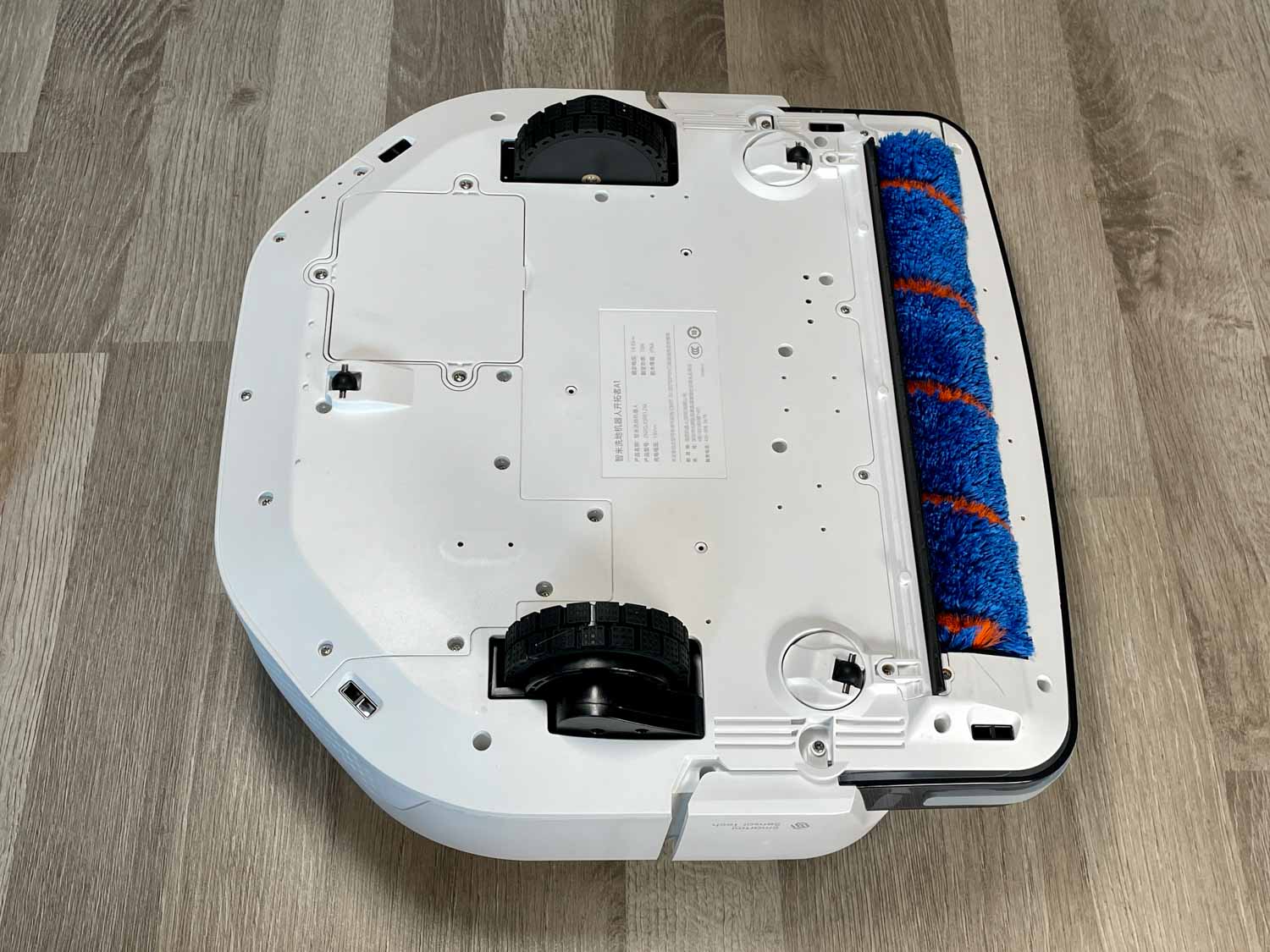 Auf der Unterseite sitzt ganz vorn im Gerät die große Walze, die sich fast über den ganzen Roboter erstreckt. Dahinter sind zwei kleine Lenkräder eingesetzt worden, die sich kurz vor den großen Haupträdern befinden. Vier verbaute Absturzsensoren sorgen zudem dafür, dass der Roboter bei seiner Reinigung nicht die Treppen oder andere Abgründe herunterfällt.