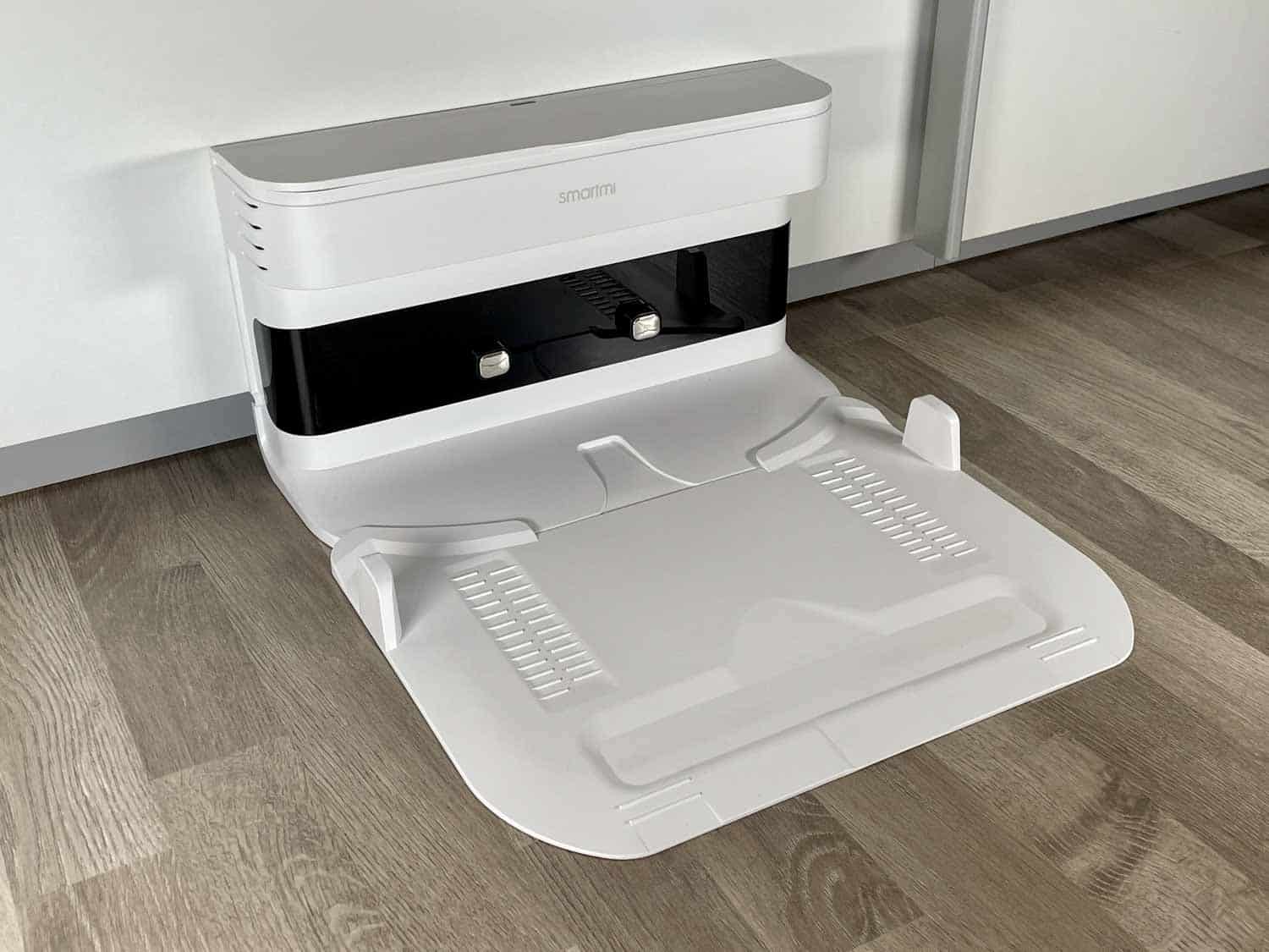 Bei der Ladestation handelt es sich ebenfalls um eine Reinigungsstation. Jedoch reinigt nicht die Station den Roboter nach jeder Reinigungsfahrt, sondern der Roboter reinigt sich vollständig selbst. Das Praktische an der Station ist, dass der Roboter nach jeder Fahrt seine nasse Walze nicht direkt auf dem Boden, sondern auf der Unterlegplatte parkt. Das verhindert Schäden am Boden.