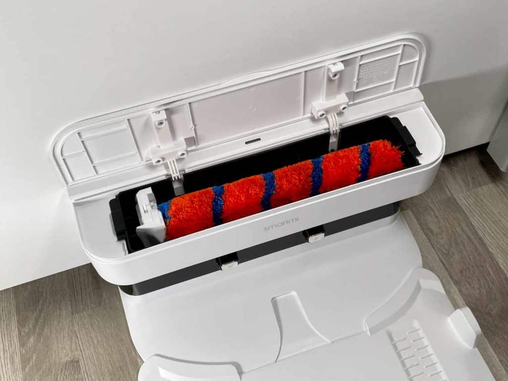 Nach jeder Reinigung fährt der Roboter automatisch zu seiner Station zurück, dockt an und reinigt seine Walze selbstständig. Dabei dreht sie sich in einer hohen Geschwindigkeit auf der Bodenplatte und benässt sie mit Wasser. Das reinigt die Bodenwalze einigermaßen sauber, jedoch gibt es bessere Methoden. Nach der Reinigung schaltet sich eine Kaltlufttrocknung der Walze zu, die ebenfalls aus dem Roboter selbst kommt und nicht von der Station. Diese ist leider nicht ausschaltbar. Die Station ist nach jeder Selbstreinigung unangenehm schmutzig und sollte gesäubert werden.