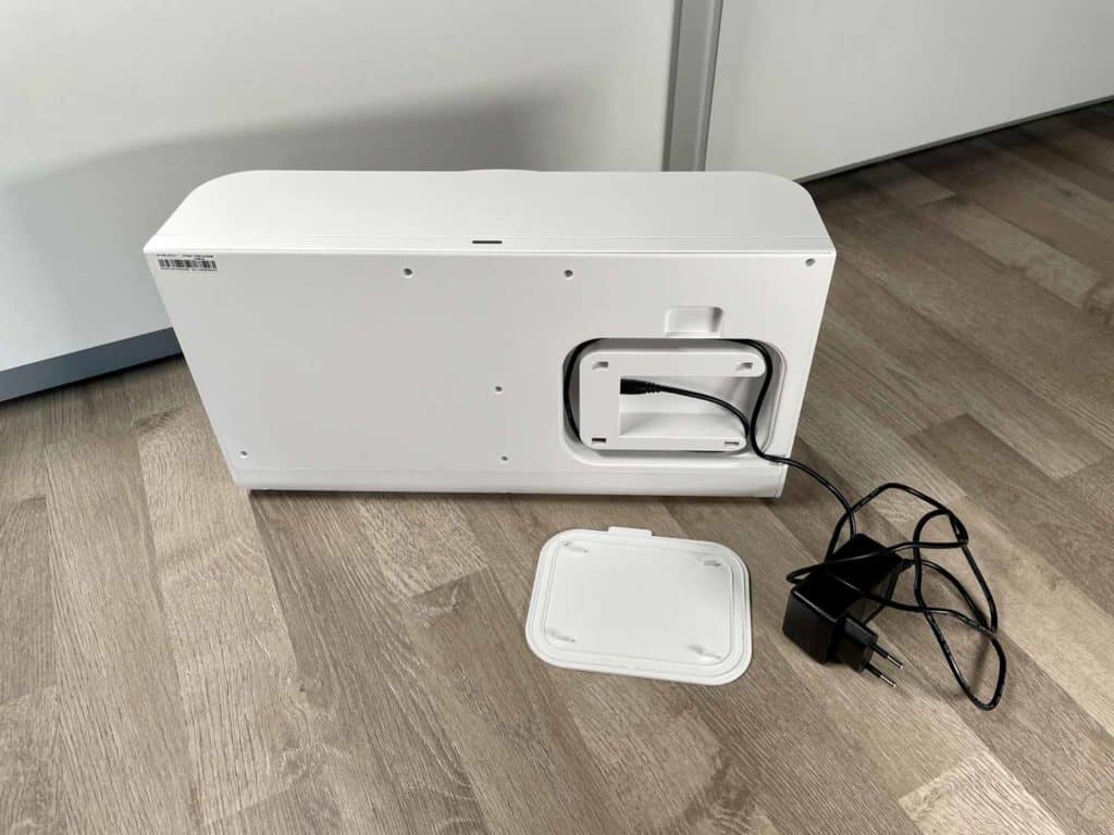 Das hintere Teil der Station ist sowohl die Ladestation als auch die Aufbewahrung der zweiten Walze. Es gibt eine weichere und eine etwas härtere Walze. Bei einem Wechsel kann die zweite Walze in der Station verstaut werden. Die Box in der die zweite Walze bis zu ihrem nächsten Einsatz verweilt wird stetig mit frischer Luft versorgt, was die Station nicht dazu befähigt irgendwo im Schlafzimmer abgestellt zu werden. Die Belüftung hört man tagsüber kaum, jedoch in der Nacht ist sie störend laut. Bedauerlicherweise kann man die Belüftung nicht ausschalten!