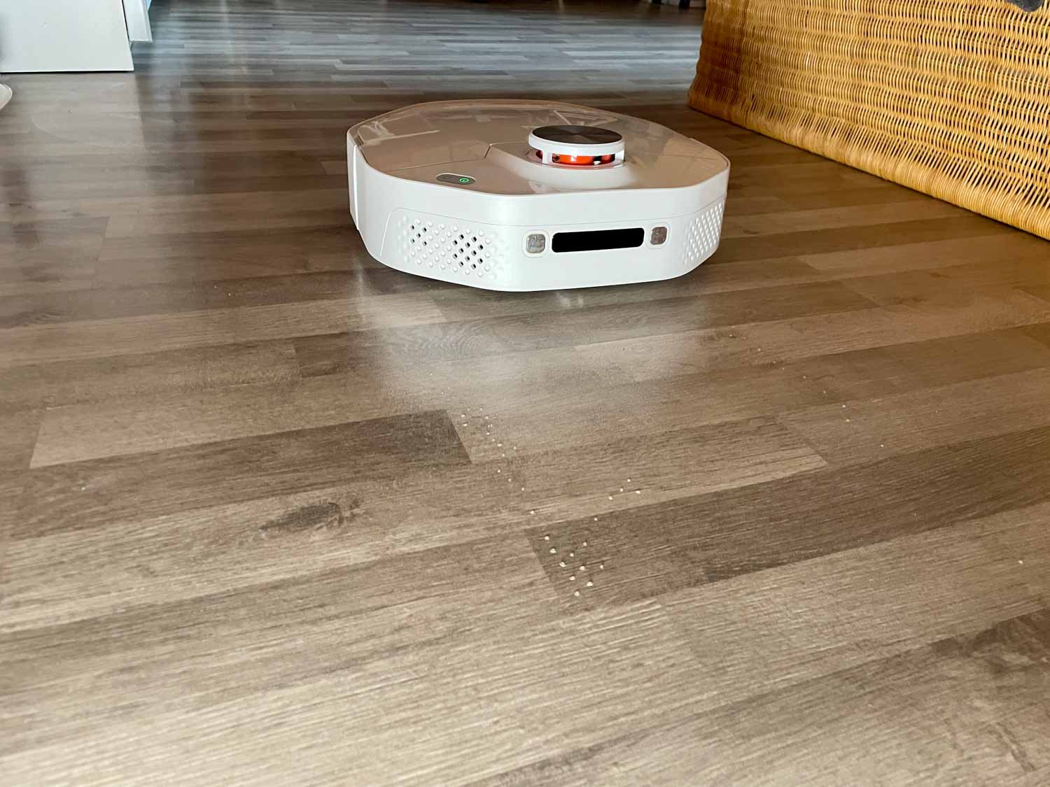Bei Ankunft des Smartmi A1 Vortex Wave war ich voller Vorfreude, denn die Wischfunktion hat sehr viel versprochen. Schade ist, dass der Roboter mehr verspricht als er leisten kann. Versteh mich nicht falsch, der Smartmi A1 macht seinen Job und das recht zuverlässig. Dennoch habe ich mir mehr erhofft, als ich bekommen habe. Endlich ein Wischroboter mit Lasernavigation! Jedoch ist diese absolut nicht ausgereift. Zudem kommt, dass er gerne ein wenig hin und her schwankt, da der Schwerpunkt des Roboters suboptimal ausgerichtet ist. Das Wischbild lässt meines Erachtens ebenfalls zu wünschen übrig, da es streifig verläuft und die Räder in diesem deutlich sichtbar sind. Was bringt mir ein sauberer Boden, der streifig ist? Die Selbstreinigung hingegen funktioniert eigentlich relativ gut, hat aber keine Funktionen, um diese individuell zu gestalten. Hier muss genommen werden, was es gibt.