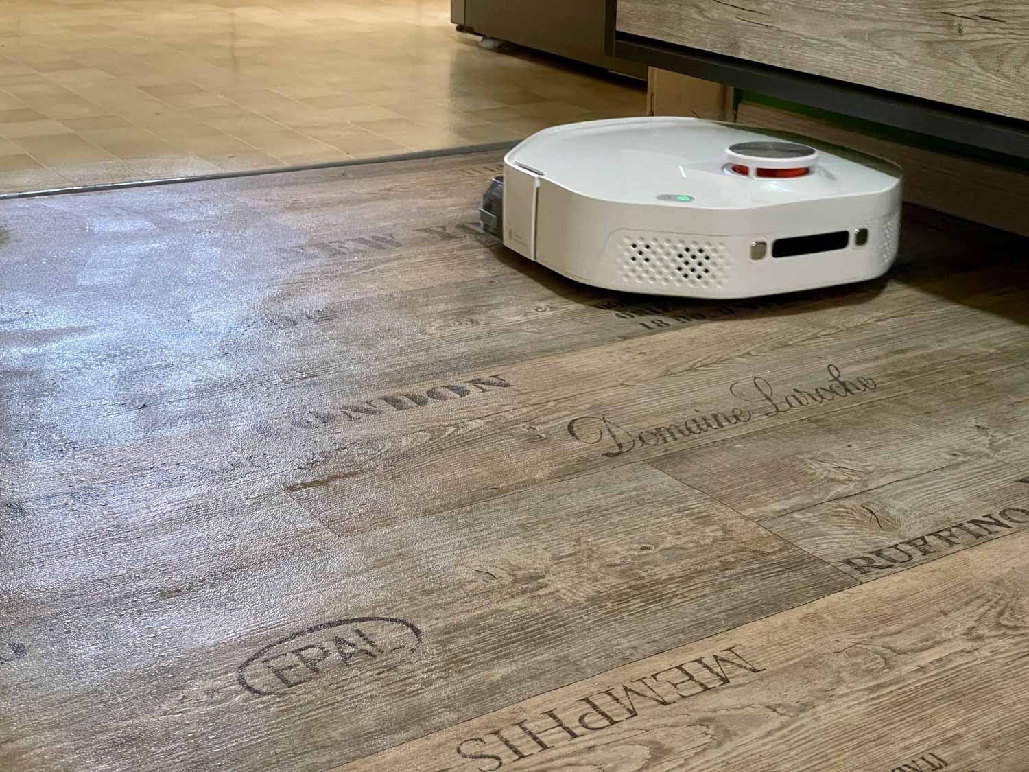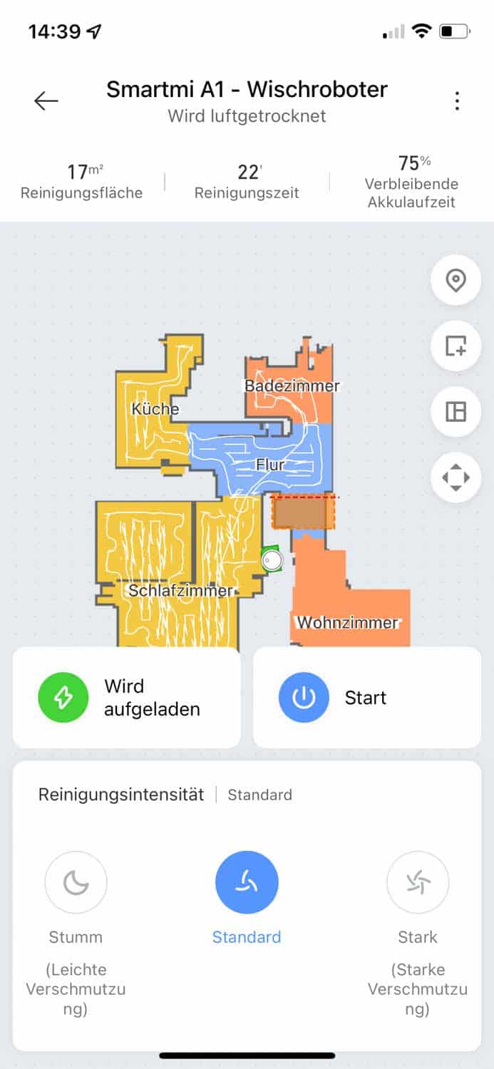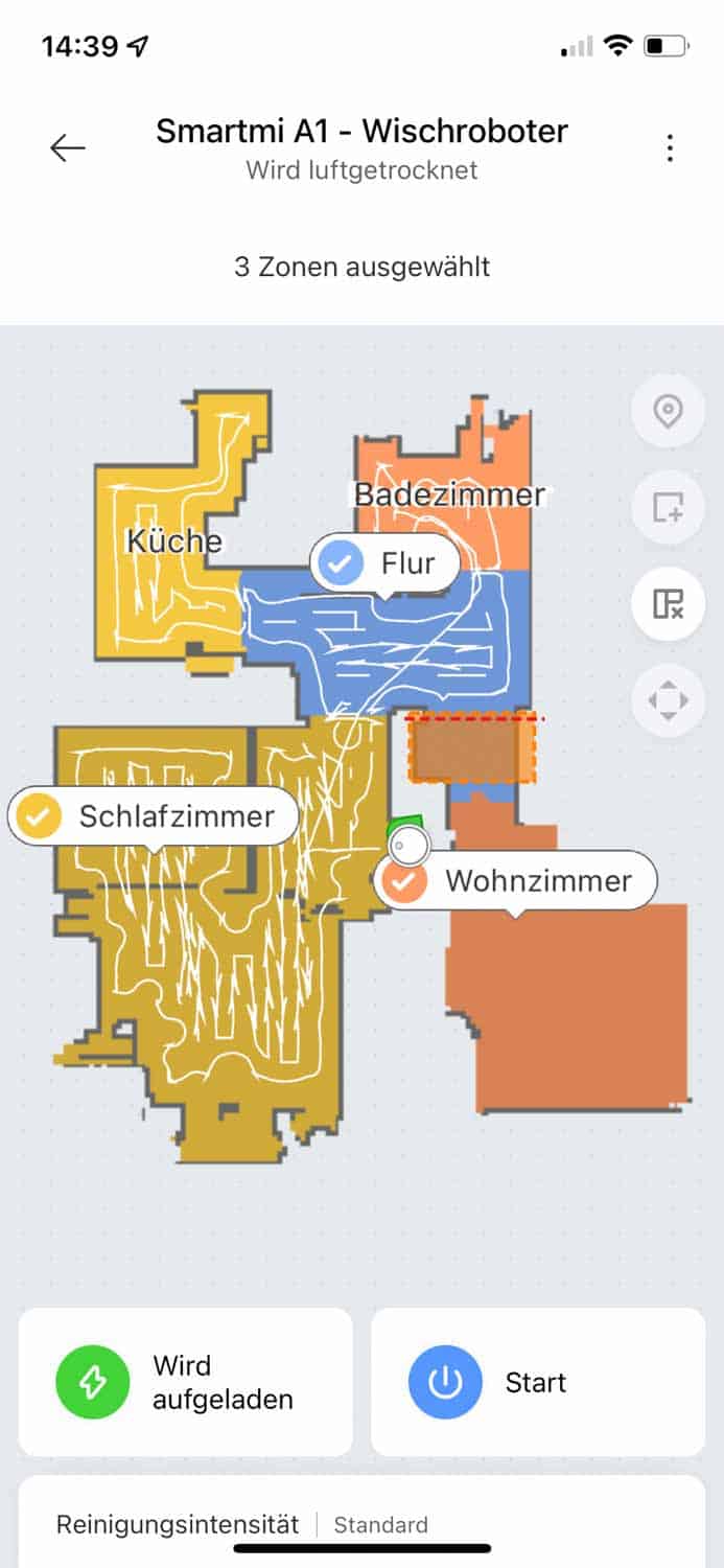 Vor jeder anstehenden Reinigung benetzt der Smartmi A1 seine Walze mit frischem Wasser aus seinem eigenen Wassertank, damit von vornherein eine feuchte Walze den Boden wischen kann. Somit spart man sich das händische befeuchten. Das Wischergebnis sieht auf den ersten Blick gleichmäßig, jedoch ziemlich nass aus. Für empfindlichere Böden würde ich den Smartmi A1 nicht unbedingt empfehlen. Selbst in der leichtesten Stufe ist der Boden noch sehr feucht. Auf den zweiten Blick jedoch habe ich im Test erkennen können, dass das Wischbild nicht gleichmäßig ist und er eine recht streifige Fahrt vollzieht. Ebenso sind die Räder des Roboters zu weit außen angebracht, was Abdrücke in der nassen Spur hinterlässt. Das gesamte Wischbild, primär auf unebenen Boden, lässt meiner Meinung nach zu wünschen übrig. Da habe ich schon besseres gesehen. Die einstellbare Y-förmige Fahrt kann auch nicht viel mehr am Wischbild verbessern.