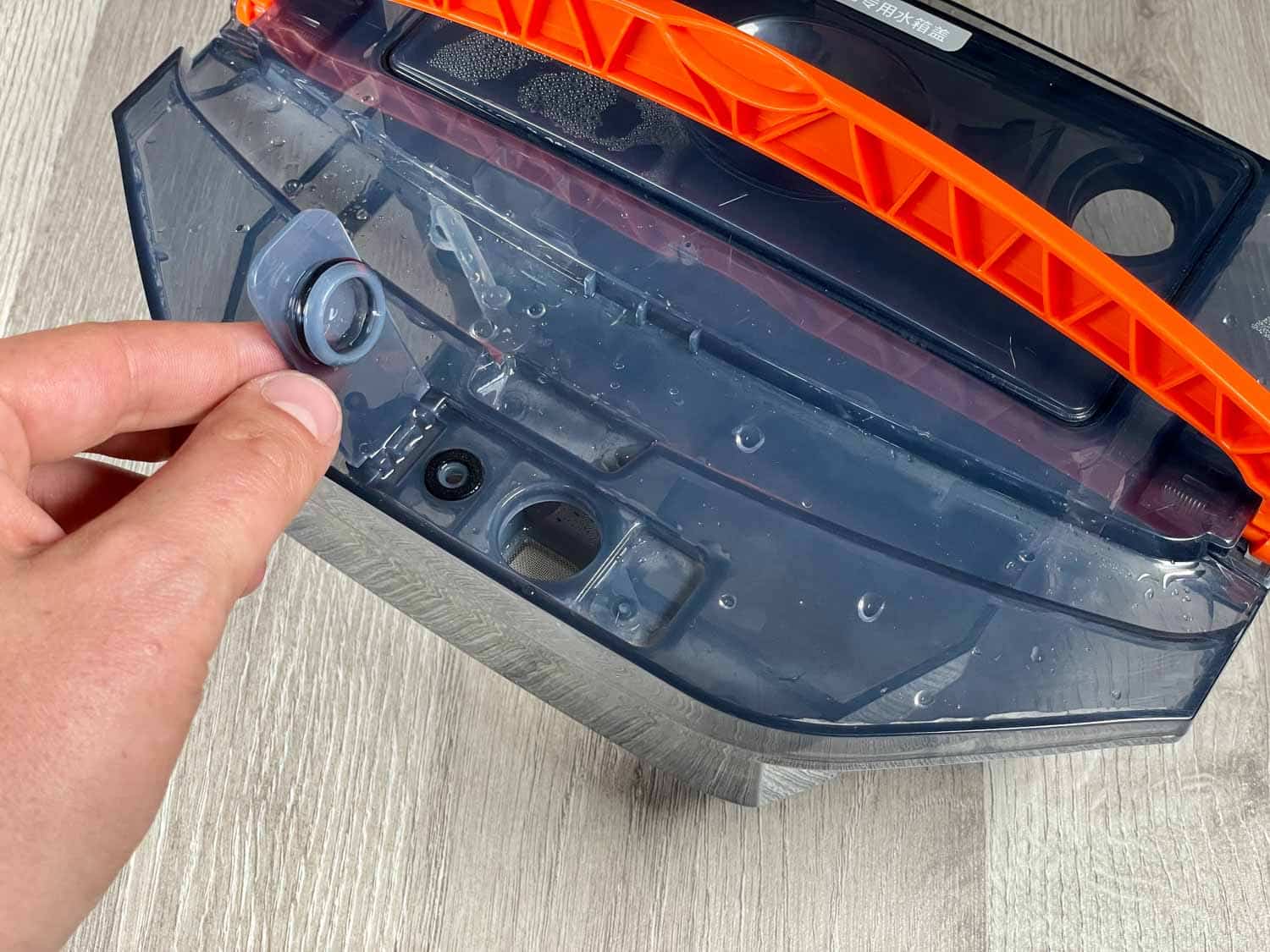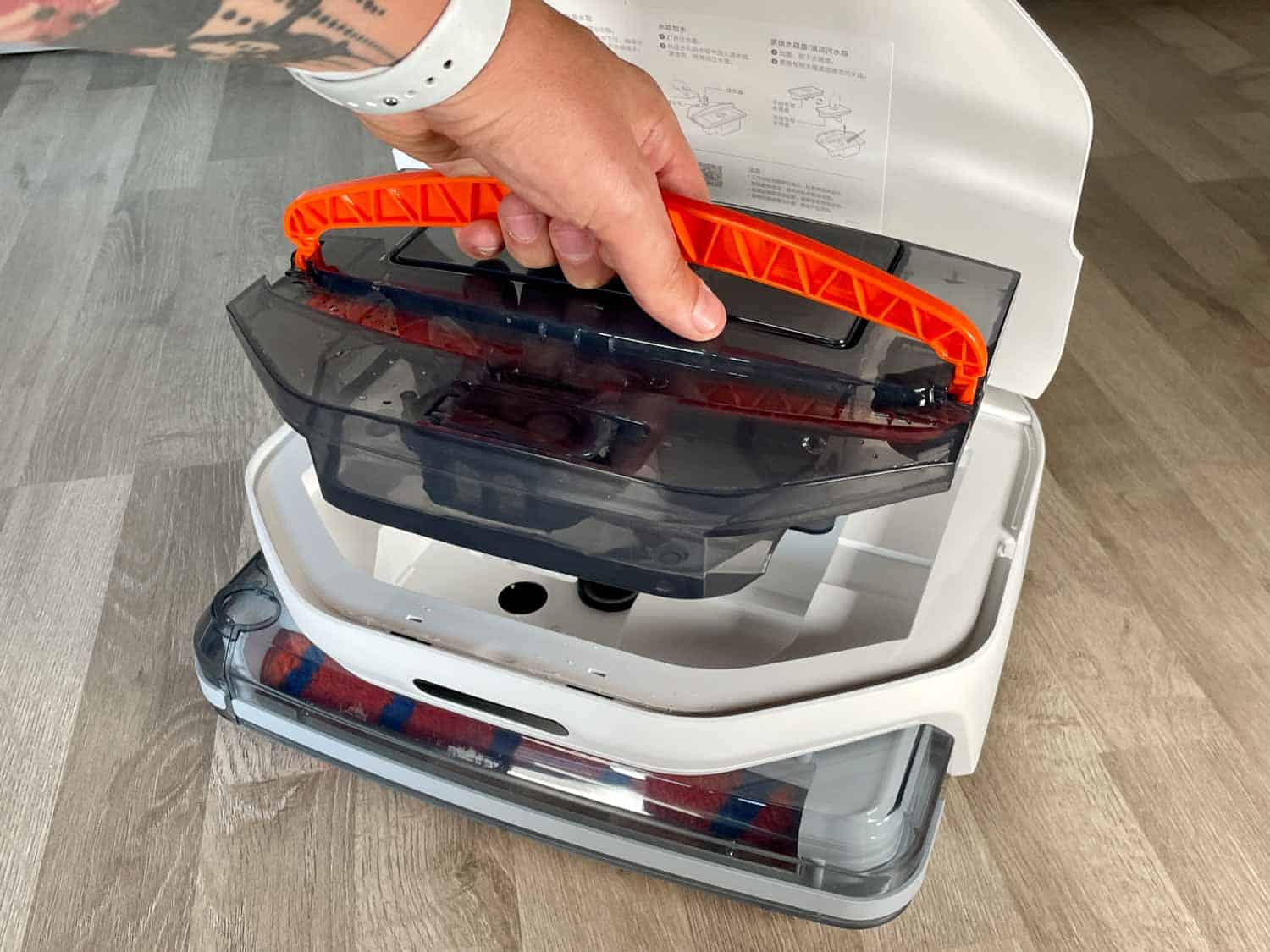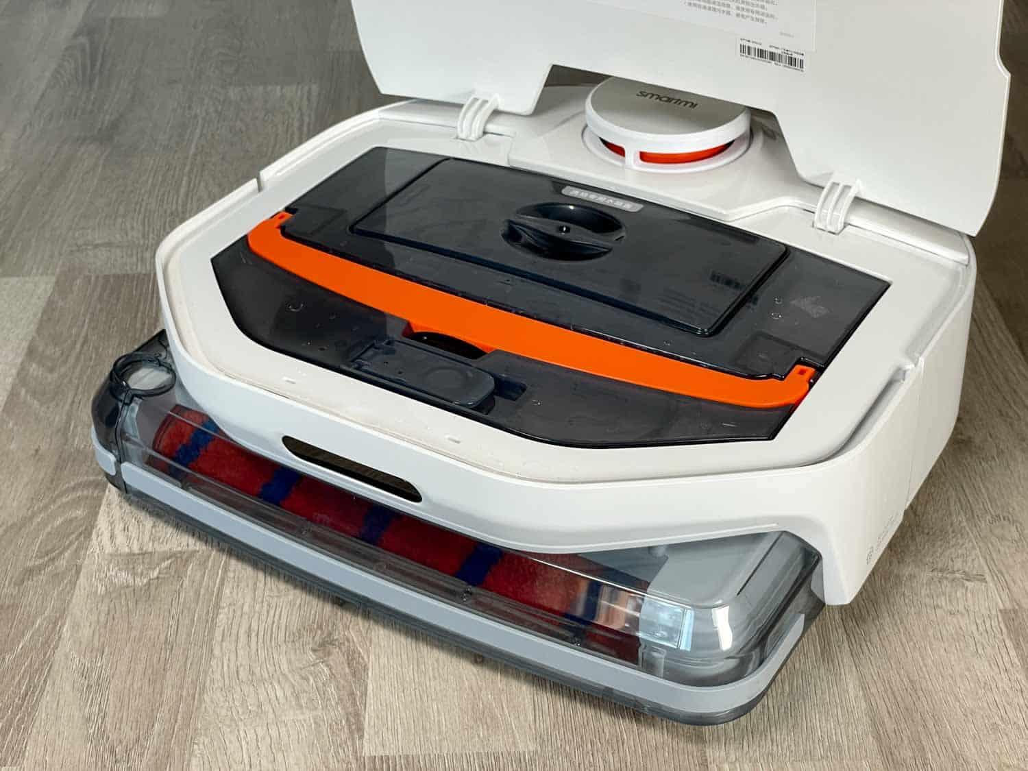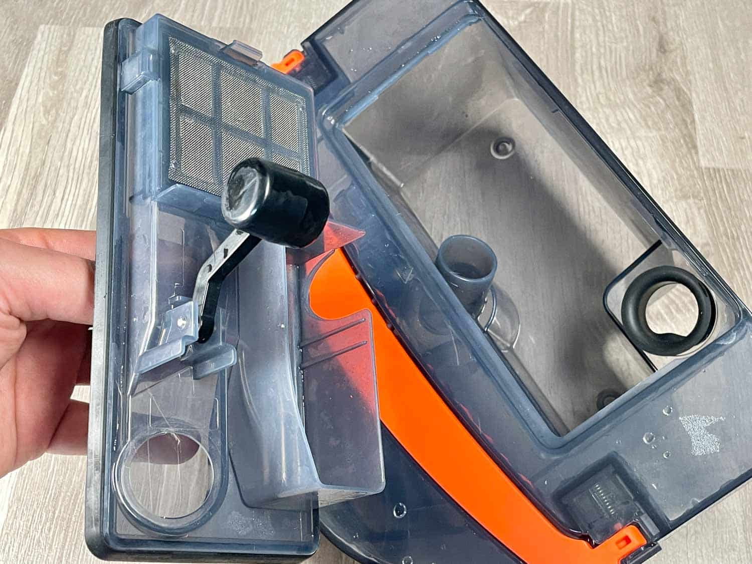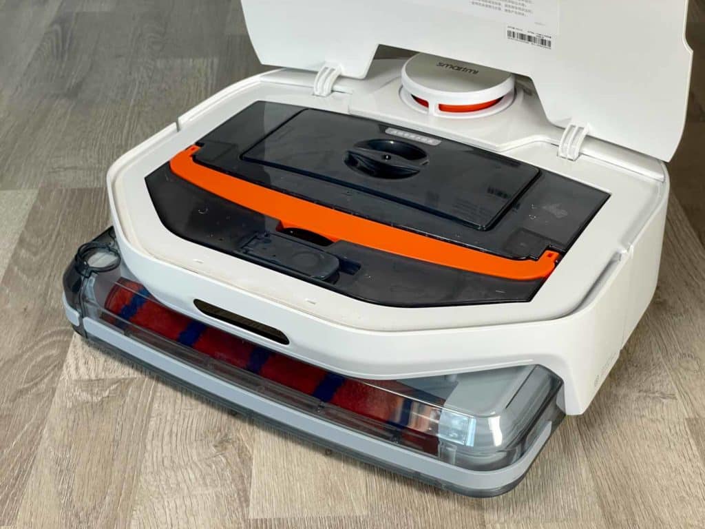 Unter seiner Haube ist der sehr große Wassertank versteckt, der für eine komfortable Entnahme mit einem orangen Haltegriff ausgestattet ist. Auf seiner Front lässt sich das Wasser einfüllen und auf der hinteren Seite das Schmutzwasser ausleeren. Das ist mit einem Filtersystem bestückt, das gröbere Verschmutzungen herausfiltern soll. Ein weiteres Modul für einen reinen Saugvorgang ist ebenso im Lieferumfang enthalten. Mehr findest du nicht unter der Haube. Weder ein Resetknopf noch eine WLAN-Anzeige sind verbaut worden.