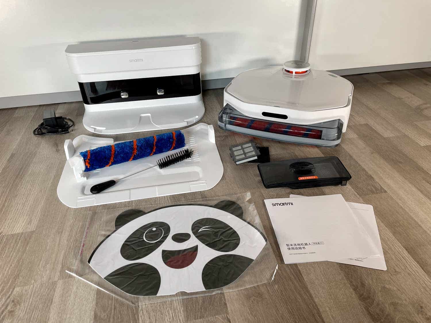 Was dich zum Lachen bringen wird, ist die Tatsache, dass ein Aufkleber für die Haube des Smartmi A1 in Form eines Pandabären im Lieferumfang enthalten ist. In Fernost stehen die Leute darauf. Ob das in Deutschland gut ankommt, ist jedoch fraglich. Kleinteile wie ein weiterer Filter, zwei verschiedene Bürsten oder verschiedene Steckertypen sind mit dabei. Ebenso eine große Ladestation mit Unterlegplatte und der Roboter selbst.