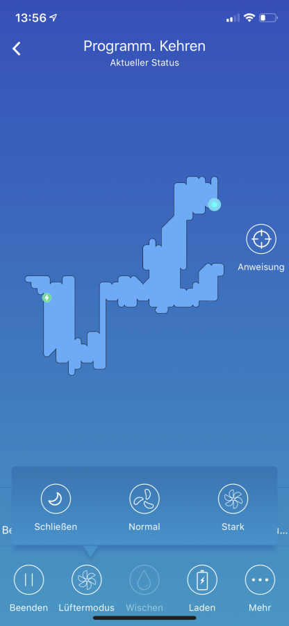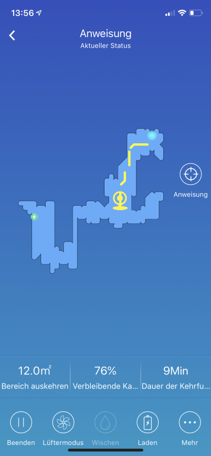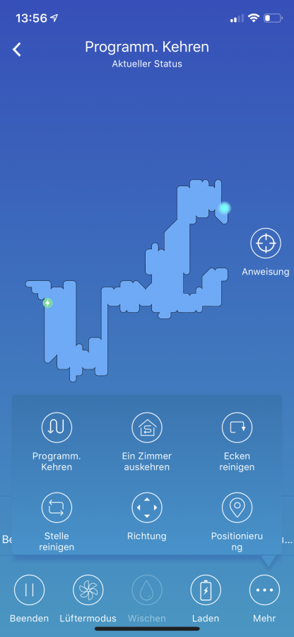 In der App ist es möglich, ein paar mehr Einstellungen vorzunehmen als es mit der Fernbedienung allein möglich ist. Die Standardfunktionen wie das Starten, das Pausieren und das Zurückschicken auf die Ladestation sind natürlich einstellbar. Ebenfalls mit an Bord ist wieder die Zeitsteuerung. Durch einzelne Zusatzfunktionen ist es möglich den Roboter in einen 30 Minuten-Modus zu schalten, den Randreinigungs- und Spotcleanmodus einzuschalten oder nun ganz neu, den Roboter an eine bestimmte Stelle auf der Karte zu schicken. Das ist die einzige Möglichkeit, mit der Karte zu interagieren. Während der Reinigung drückt man einfach auf eine Stelle der Karte, die er dann anfährt und im Spotcleanmodus reinigt. Auch das Fernsteuern ist möglich.