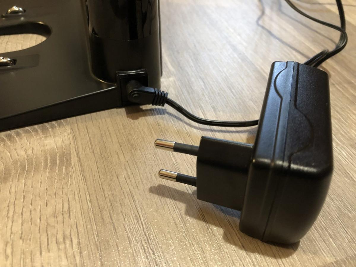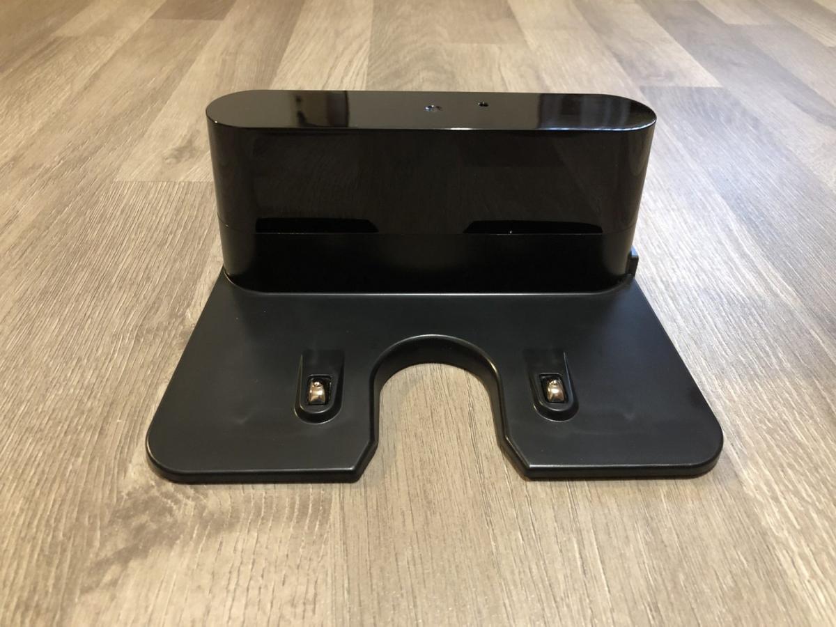 Die mitgelieferte Ladestation ist relativ klein und komplett in Schwarz gehalten. Sie besitzt eine LED auf der Oberseite, die den Anschluss an das Stromnetz durch Blinken anzeigt. Sie besitzt leider keine Kabelaufwicklung und das separate Netzkabel kann nur von einer Seite aus angeschlossen werden. Die Ladestation ist exakt dieselbe wie die der anderen Tesvor Modelle.