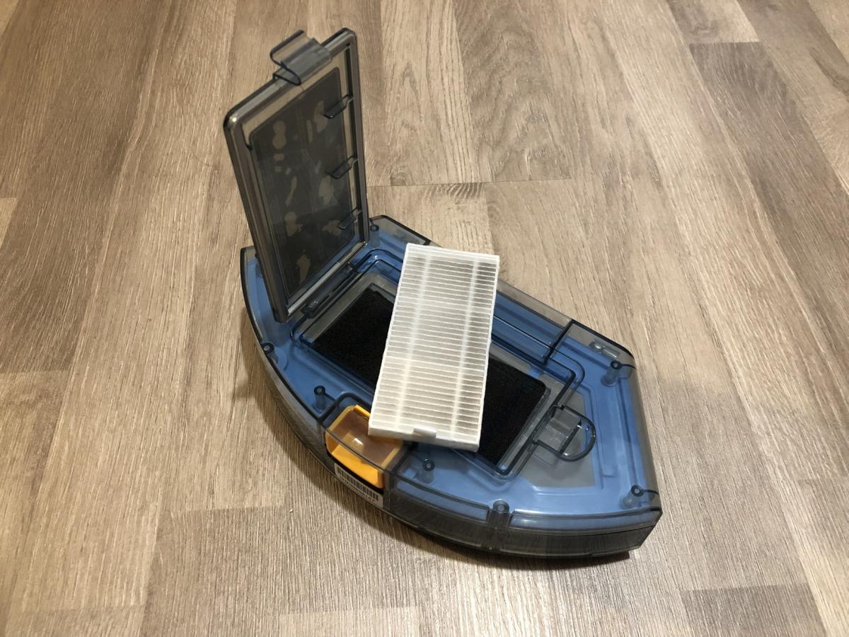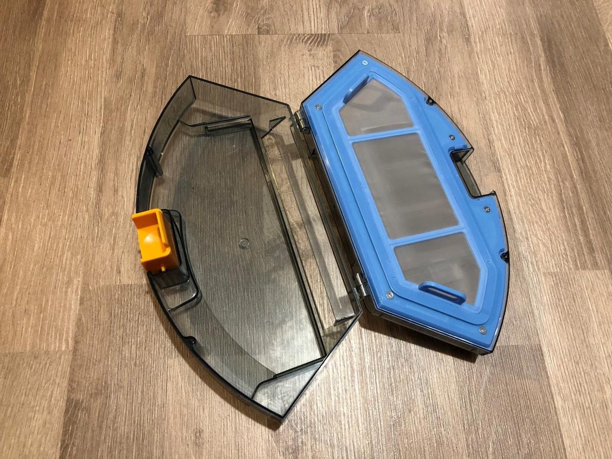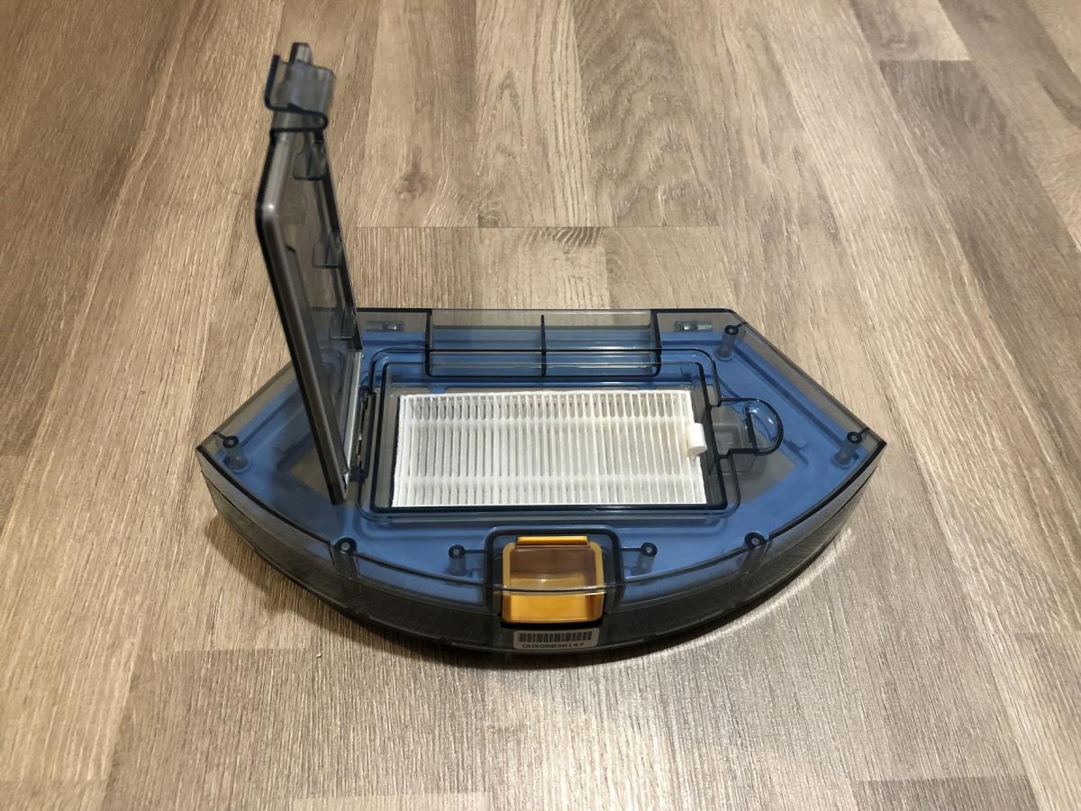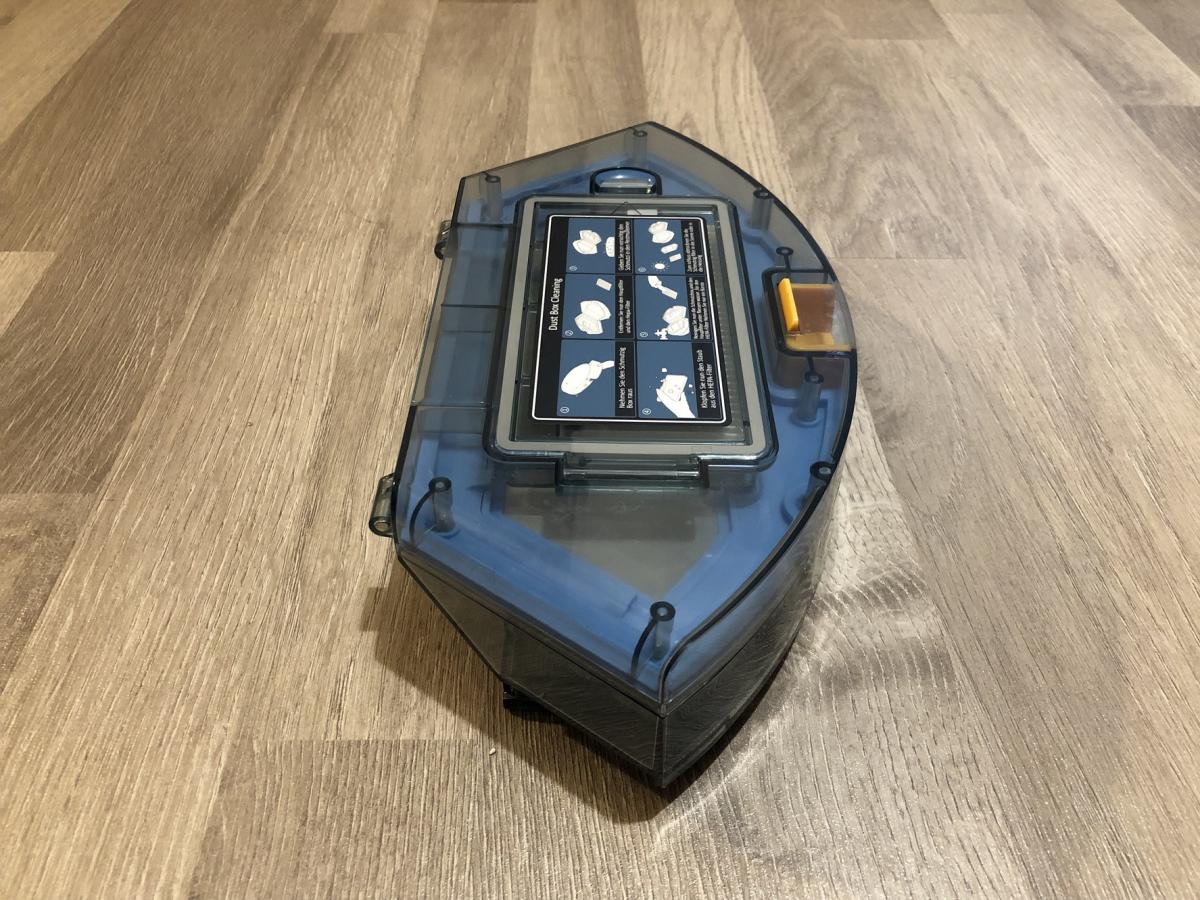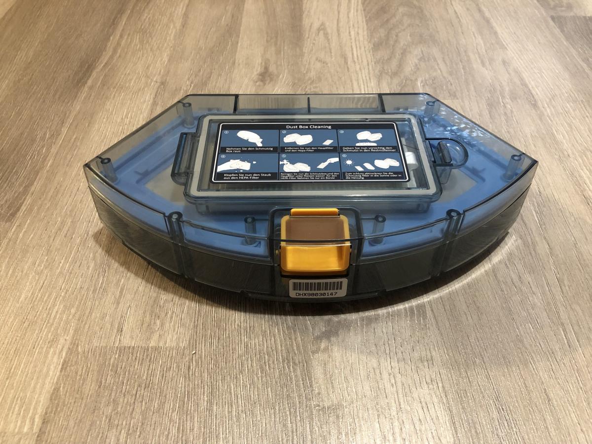Der transparent gehaltene Staubbehälter fasst ein Volumen von 0,6 Liter und ist somit im oberen Drittel der Größenverhältnisse von Staubbehältern angesiedelt. Er ist einfach aus dem Roboter zu entnehmen und auch das Leeren stellt sich als sehr leicht und hygienisch heraus. Die Staubfilter sind in einem zusätzlichen Fach vom eigentlichen Behälter getrennt und lassen sich durch eine Klappe zum Reinigen entnehmen. Der Staubbehälter ist übrigens derselbe wie bei allen anderen Modellen von Tesvor und somit austauschbar. Er besitzt leider wieder keine Rückschlagklappe, verliert jedoch keinen Schmutz bei der Reinigung.
