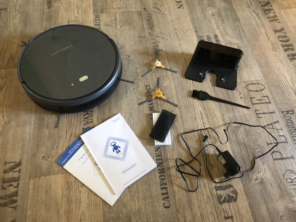Im Lieferumfang des Tesvor X500 findet ihr den Roboter, 4 Seitenbürsten, 2 Feinstaubfilter mit dazugehörigen Schwammfiltern, eine Fernbedienung, eine Ladestation, ein Netzkabel mit Eurostecker, ein recht großes Reinigungstool und die obligatorischen Bedienungsanleitungen. Somit ist der Lieferumfang für ein Saugroboter dieser Preisklasse mehr als zufriedenstellend und auch die Bedienungsanleitungen enthalten einen deutschen Teil. Achtung, auf dem folgenden Bild fehlt die Fernbedienung.