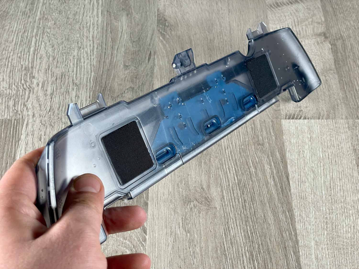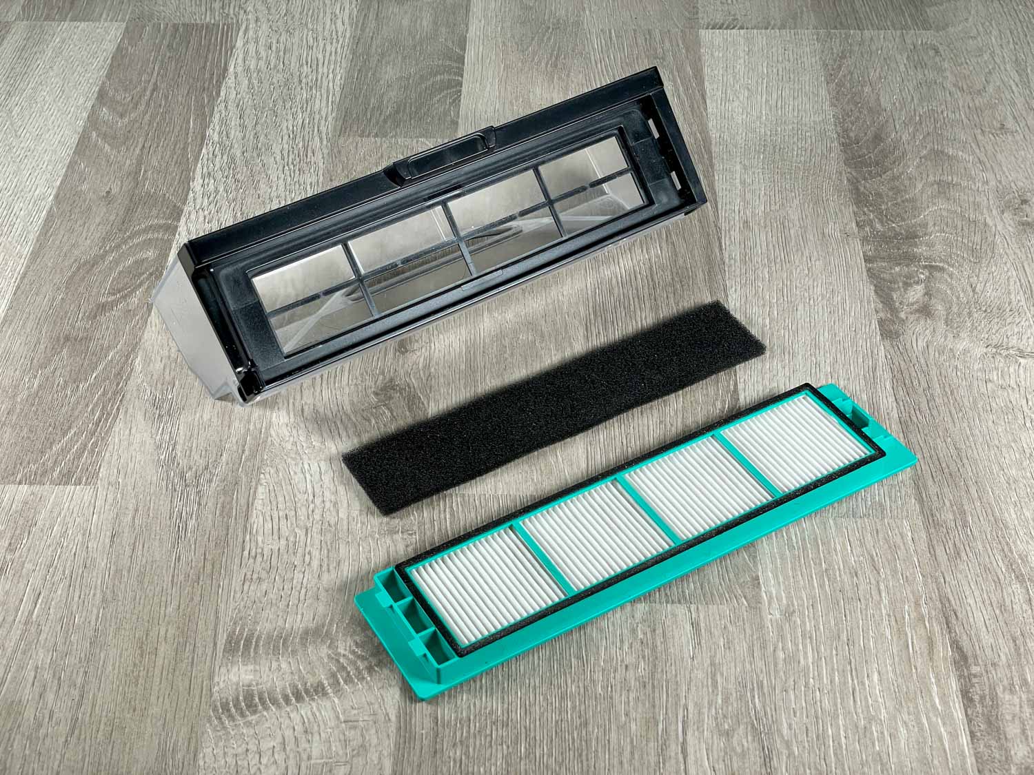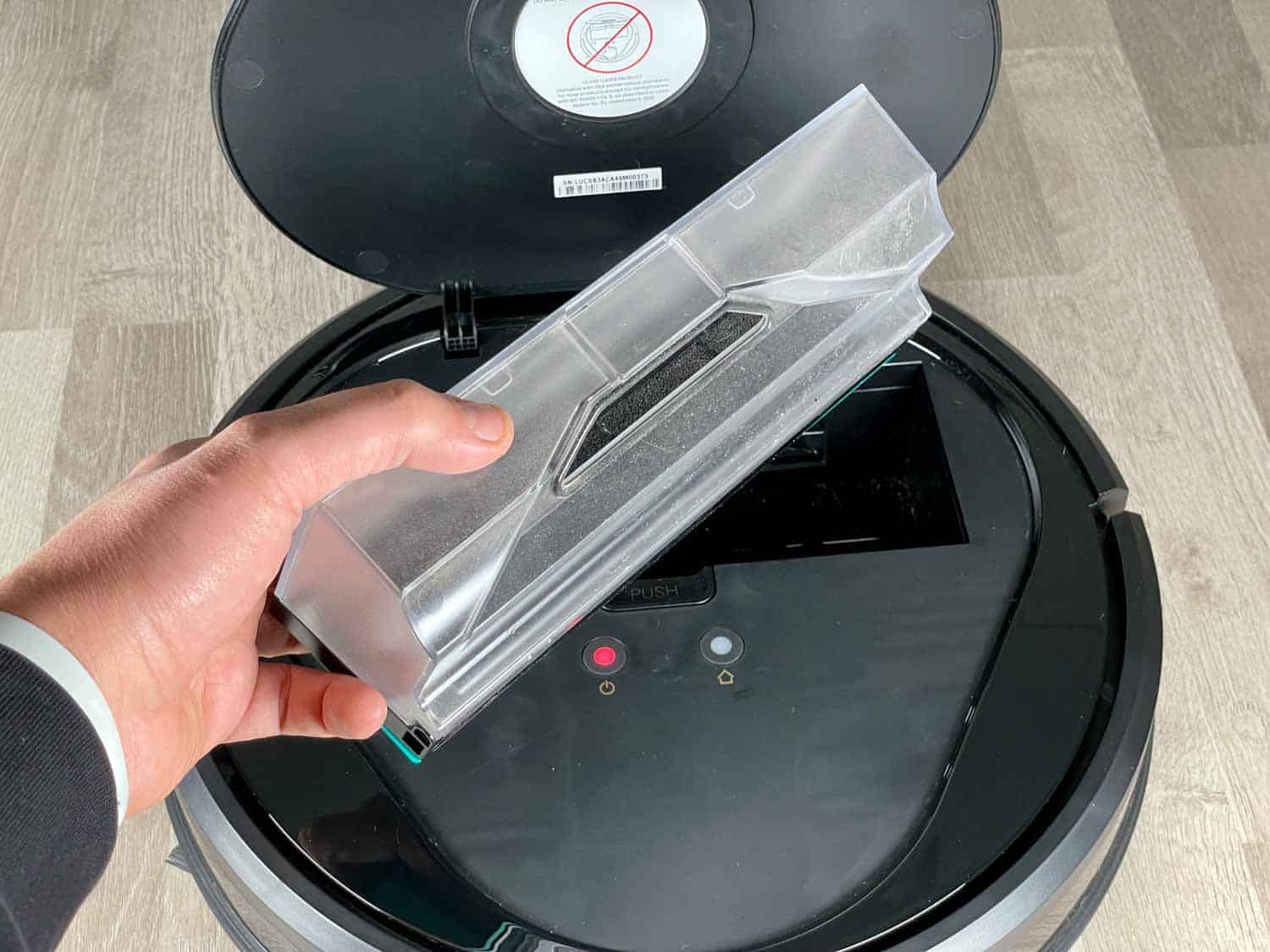 Der Staubbehälter, der übrigens vollständig transparent gehalten ist, lässt sich einfach aus dem Roboter herausnehmen. Das Ausleeren hingegen stellt sich als etwas schwerer heraus, da Streben die Öffnung etwas blockieren. Hier muss ein wenig geschüttelt werden. Ein Feinstaubfilter, der von einem Schwammfilter geschützt wird, sorgt für eine saubere Abluft.