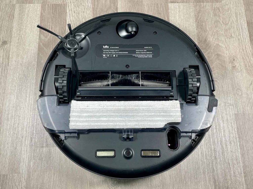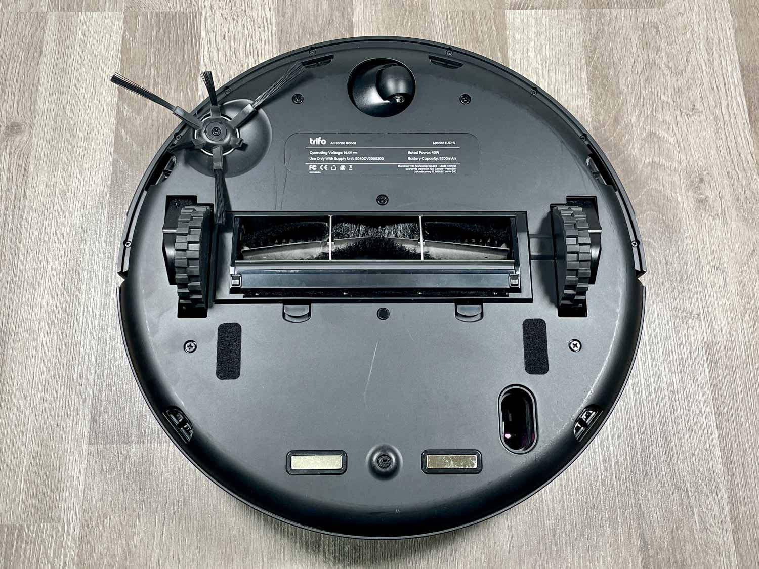 Auf der Unterseite des Roboters findest du vier Absturzsensoren, die verhindern, dass der Trifo Lucy die Treppen herunterfällt. Eingesetzt ist eine Kombibodenbürste, die aus Gummilamellen und Borsten besteht. Eine sehr merkwürdig aussehende Seitenbürste kehrt den Schmutz zur Bodenbürste hin. Diese ist jedoch recht instabil und hat in meinem Test schon einige Borsten verloren. Die Ladekontakte befinden sich auf dem hinteren Teil der Unterseite, da der Roboter mit dem Heck voran andockt. Neben diesen befindet sich noch ein Sensor, der den Boden abtastet. Ich schätze, dieser ist für die Teppicherkennung zuständig.