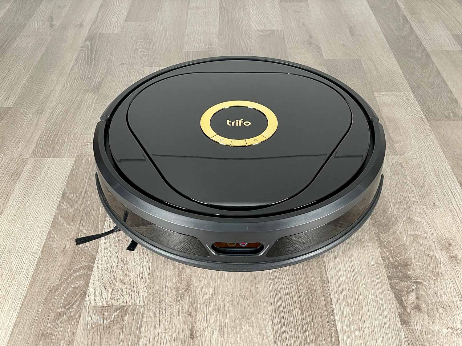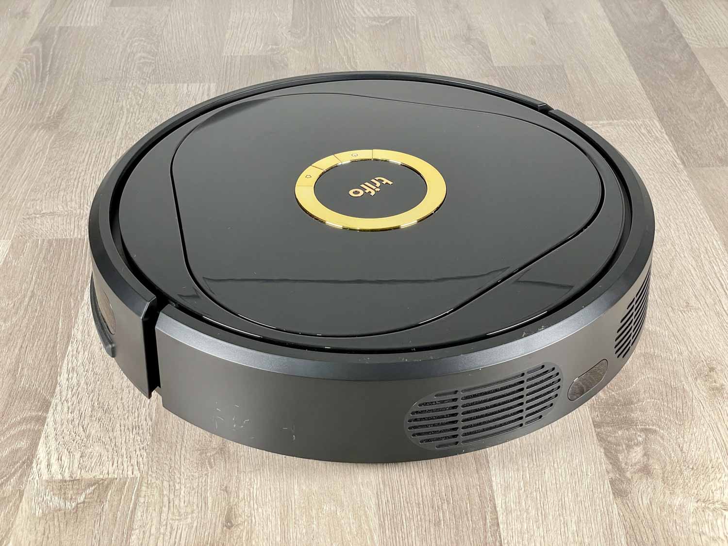 Der Trifo Lucy kommt in einem recht schickem Designmix aus mattem und glänzenden Schwarz daher und wurde mit einem goldenen Ring und goldenen Logo verziert. Auf diesem goldenen Ring befinden sich die Bedienelemente, mit denen man den Roboter manuell starten, stoppen oder zur Ladestation zurückschicken kann. Auf der Front sitzt der obligatorische Bumper, der die HD-Kamera und dazugehörigen Sensoren besitzt. Zwei Kunststoffgläser auf diesem verbergen weitere Sensoren. Am Heck findest du lediglich zwei Lüftungsgitter und ein weiteren Sensor für die Einfahrt in die Ladestation.