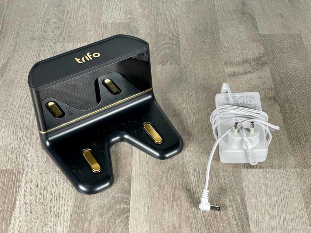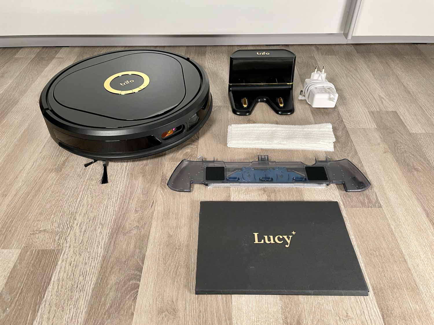 Im Lieferumfang des Trifo Lucy gibt es das allseits bekannte Standard-Paket. Sowohl der Roboter als auch die Ladestation fallen dir sofort entgegen. Zudem gibt es natürlich eine Seitenbürste, die einfach angesteckt werden kann und eine Wischplatte für die Wischfunktion.