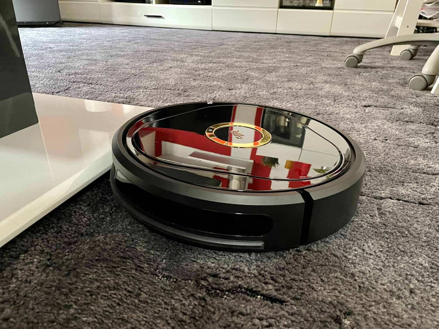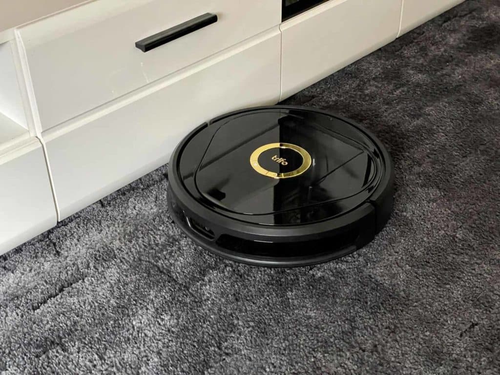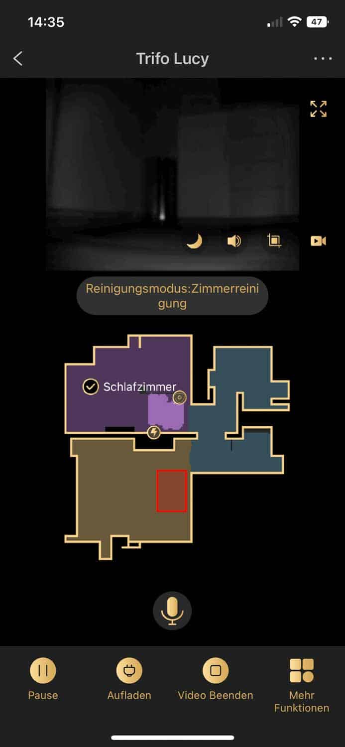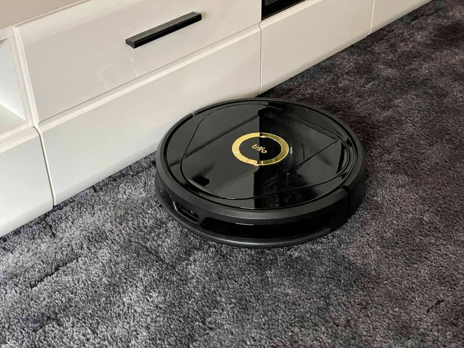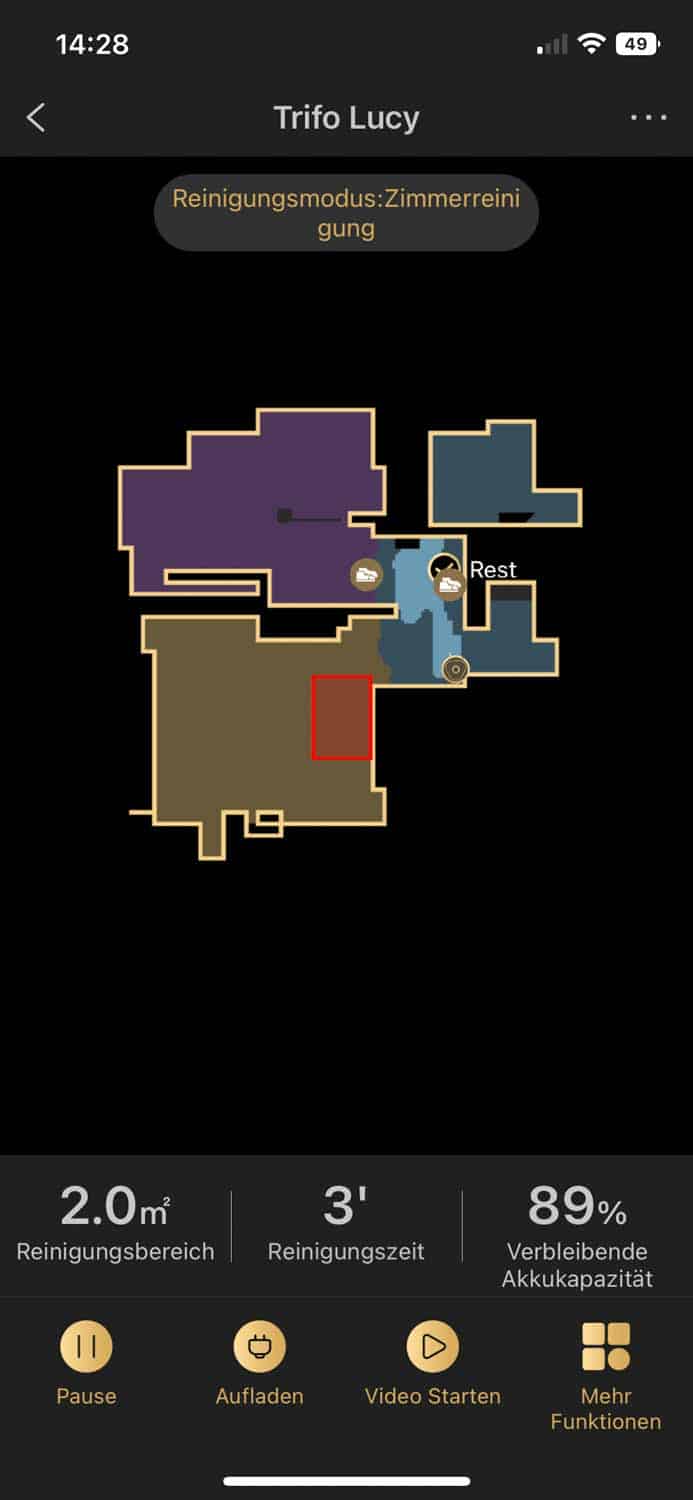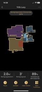 Der Trifo Lucy zeigte im Test, dass er zwar gerade Bahnen fahren kann, jedoch gerne Stellen auslässt. Er hält zuverlässig vor aufkommenden Wänden und Möbeln an, um diese nicht zu rammen. Jedoch knallt er gerne mit Wucht vor sehr dünne Gegenstände oder ändert mitten im Raum seine Richtung. Die Navigation hat sich als „Naja“ herausgestellt. Hier habe ich dank AI-Kamera mehr erwartet. Der Trifo Lucy erstellt eine Raumkarte auf dem Smartphone, an der er sich zukünftig orientiert. Zudem gibt der Hersteller an, dass der Roboter mit jeder neuen Fahrt dazulernt und seine Umgebung besser kennenlernt. In meinem Test konnte ich keinen Unterschied zwischen der ersten und der zehnten Fahrt ausmachen.